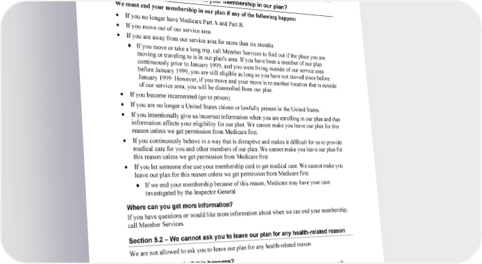 98 2024 Evidence of Coverage for WA PEBB Kaiser Permanente Senior Advantage Chapter 8: Ending your membership in our plan Section 5 — We must end your membership in our plan in certain situations Section 5.1 – When must we end your membership in our plan? We must end your membership in our plan if any of the following happen: • If you no longer have Medicare Part A and Part B. • If you move out of our service area. • If you are away from our service area for more than six months. ♦ If you move or take a long trip, call Member Services to find out if the place you are moving or traveling to is in our plan's area. If you have been a member of our plan continuously prior to January 1999, and you were living outside of our service area before January 1999, you are still eligible as long as you have not moved since before January 1999. However, if you move and your move is to another location that is outside of our service area, you will be disenrolled from our plan. • If you become incarcerated (go to prison). • If you are no longer a United States citizen or lawfully present in the United States. • If you intentionally give us incorrect information when you are enrolling in our plan and that information affects your eligibility for our plan. We cannot make you leave our plan for this reason unless we get permission from Medicare first. • If you continuously behave in a way that is disruptive and makes it difficult for us to provide medical care for you and other members of our plan. We cannot make you leave our plan for this reason unless we get permission from Medicare first. • If you let someone else use your membership card to get medical care. We cannot make you leave our plan for this reason unless we get permission from Medicare first. ♦ If we end your membership because of this reason, Medicare may have your case investigated by the Inspector General. Where can you get more information? If you have questions or would like more information about when we can end your membership, call Member Services. Section 5.2 – We cannot ask you to leave our plan for any health-related reason We are not allowed to ask you to leave our plan for any health-related reason. What should you do if this happens? If you feel that you are being asked to leave our plan because of a health-related reason, call Medicare at 1-800-MEDICARE (1-800-633-4227) 24 hours a day, 7 days a week. (TTY 1-877-486-2048). kp.org