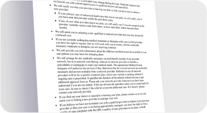 2024 Evidence of Coverage for WA PEBB Kaiser Permanente Senior Advantage 43 Chapter 3: Using our plan for your medical services What if a specialist or another network provider leaves our plan? We may make changes to the hospitals, doctors, and specialists (providers) that are part of your plan during the year. If your doctor or specialist leaves your plan, you have certain rights and protections that are summarized below: • Even though our network of providers may change during the year, Medicare requires that we furnish you with uninterrupted access to qualified doctors and specialists. • We will notify you that your provider is leaving our plan so that you have time to select a new provider. ♦ If your primary care or behavioral health provider leaves our plan, we will notify you if you have seen that provider within the past three years. ♦ If any of your other providers leave our plan, we will notify you if you are assigned to the provider, currently receive care from them, or have seen them within the past three months. • We will assist you in selecting a new qualified in-network provider that you may access for continued care. • If you are currently undergoing medical treatment or therapies with your current provider, you have the right to request, and we will work with you to ensure, that the medically necessary treatment or therapies you are receiving continue. • We will provide you with information about the different enrollment periods available to you and options you may have for changing plans. • We will arrange for any medically necessary covered benefit outside of our provider network, but at in-network cost-sharing, when an in-network provider or benefit is unavailable or inadequate to meet your medical needs. The appropriate Medical Group designee will authorize the services if they determine that the covered services are medically necessary and are not available from a network provider. Referrals to out-of-network providers will be for a specific treatment plan, which may include a standing referral if ongoing care is prescribed. It specifies the duration of the referral without having to get additional approval from us. Please ask your network provider what services have been authorized if you are not certain. If the out-of-network specialist wants you to come back for more care, be sure to check if the referral covers the additional care. If it doesn't, please contact your network provider. • If you find out your doctor or specialist is leaving your plan, please contact us so we can assist you in finding a new provider to manage your care. • If you believe we have not furnished you with a qualified provider to replace your previous provider or that your care is not being appropriately managed, you have the right to file a quality of care complaint with the QIO, a quality of care grievance to our plan, or both. Please see Chapter 7. 1-877-221-8221 (TTY 711), 7 days a week, 8 a.m. to 8 p.m.