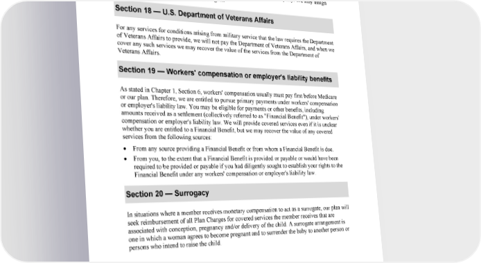 104 2024 Evidence of Coverage for WA PEBB Kaiser Permanente Senior Advantage Chapter 9: Legal notices If your estate, parent, guardian, or conservator asserts a claim against a third party based on your injury or illness, your estate, parent, guardian, or conservator and any settlement or judgment recovered by the estate, parent, guardian, or conservator shall be subject to our liens and other rights to the same extent as if you had asserted the claim against the third party. We may assign our rights to enforce our liens and other rights. Section 18 — U.S. Department of Veterans Affairs For any services for conditions arising from military service that the law requires the Department of Veterans Affairs to provide, we will not pay the Department of Veterans Affairs, and when we cover any such services we may recover the value of the services from the Department of Veterans Affairs. Section 19 — Workers' compensation or employer's liability benefits As stated in Chapter 1, Section 6, workers' compensation usually must pay first before Medicare or our plan. Therefore, we are entitled to pursue primary payments under workers' compensation or employer's liability law. You may be eligible for payments or other benefits, including amounts received as a settlement (collectively referred to as "Financial Benefit"), under workers' compensation or employer's liability law. We will provide covered services even if it is unclear whether you are entitled to a Financial Benefit, but we may recover the value of any covered services from the following sources: • From any source providing a Financial Benefit or from whom a Financial Benefit is due. • From you, to the extent that a Financial Benefit is provided or payable or would have been required to be provided or payable if you had diligently sought to establish your rights to the Financial Benefit under any workers' compensation or employer's liability law. Section 20 — Surrogacy In situations where a member receives monetary compensation to act as a surrogate, our plan will seek reimbursement of all Plan Charges for covered services the member receives that are associated with conception, pregnancy and/or delivery of the child. A surrogate arrangement is one in which a woman agrees to become pregnant and to surrender the baby to another person or persons who intend to raise the child. kp.org