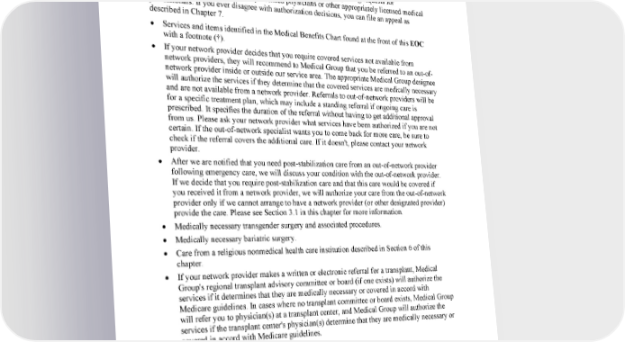 42 2024 Evidence of Coverage for WA PEBB Kaiser Permanente Senior Advantage Chapter 3: Using our plan for your medical services Prior authorization For the services and items listed below and in the Medical Benefits Chart found at the front of this EOC, your network provider will need to get approval in advance from our plan or Medical Group (this is called getting "prior authorization"). Decisions regarding requests for authorization will be made only by licensed physicians or other appropriately licensed medical professionals. If you ever disagree with authorization decisions, you can file an appeal as described in Chapter 7. • Services and items identified in the Medical Benefits Chart found at the front of this EOC with a footnote (†). • If your network provider decides that you require covered services not available from network providers, they will recommend to Medical Group that you be referred to an out-of- network provider inside or outside our service area. The appropriate Medical Group designee will authorize the services if they determine that the covered services are medically necessary and are not available from a network provider. Referrals to out-of-network providers will be for a specific treatment plan, which may include a standing referral if ongoing care is prescribed. It specifies the duration of the referral without having to get additional approval from us. Please ask your network provider what services have been authorized if you are not certain. If the out-of-network specialist wants you to come back for more care, be sure to check if the referral covers the additional care. If it doesn't, please contact your network provider. • After we are notified that you need post-stabilization care from an out-of-network provider following emergency care, we will discuss your condition with the out-of-network provider. If we decide that you require post-stabilization care and that this care would be covered if you received it from a network provider, we will authorize your care from the out-of-network provider only if we cannot arrange to have a network provider (or other designated provider) provide the care. Please see Section 3.1 in this chapter for more information. • Medically necessary transgender surgery and associated procedures. • Medically necessary bariatric surgery. • Care from a religious nonmedical health care institution described in Section 6 of this chapter. • If your network provider makes a written or electronic referral for a transplant, Medical Group's regional transplant advisory committee or board (if one exists) will authorize the services if it determines that they are medically necessary or covered in accord with Medicare guidelines. In cases where no transplant committee or board exists, Medical Group will refer you to physician(s) at a transplant center, and Medical Group will authorize the services if the transplant center's physician(s) determine that they are medically necessary or covered in accord with Medicare guidelines. kp.org