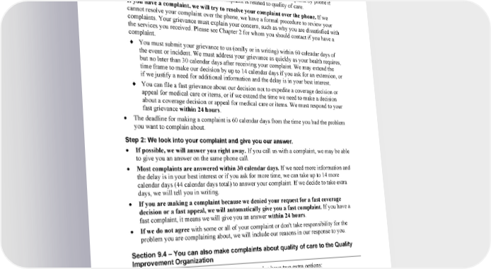 94 2024 Evidence of Coverage for WA PEBB Kaiser Permanente Senior Advantage Chapter 7: What to do if you have a problem or complaint (coverage decisions, appeals, complaints) • If you do not wish to call (or you called and were not satisfied), you can put your complaint in writing and send it to us. If you put your complaint in writing, we will respond to you in writing. We will also respond in writing when you make a complaint by phone if you request a written response or your complaint is related to quality of care. • If you have a complaint, we will try to resolve your complaint over the phone. If we cannot resolve your complaint over the phone, we have a formal procedure to review your complaints. Your grievance must explain your concern, such as why you are dissatisfied with the services you received. Please see Chapter 2 for whom you should contact if you have a complaint. ♦ You must submit your grievance to us (orally or in writing) within 60 calendar days of the event or incident. We must address your grievance as quickly as your health requires, but no later than 30 calendar days after receiving your complaint. We may extend the time frame to make our decision by up to 14 calendar days if you ask for an extension, or if we justify a need for additional information and the delay is in your best interest. ♦ You can file a fast grievance about our decision not to expedite a coverage decision or appeal for medical care or items, or if we extend the time we need to make a decision about a coverage decision or appeal for medical care or items. We must respond to your fast grievance within 24 hours. • The deadline for making a complaint is 60 calendar days from the time you had the problem you want to complain about. Step 2: We look into your complaint and give you our answer. • If possible, we will answer you right away. If you call us with a complaint, we may be able to give you an answer on the same phone call. • Most complaints are answered within 30 calendar days. If we need more information and the delay is in your best interest or if you ask for more time, we can take up to 14 more calendar days (44 calendar days total) to answer your complaint. If we decide to take extra days, we will tell you in writing. • If you are making a complaint because we denied your request for a fast coverage decision or a fast appeal, we will automatically give you a fast complaint. If you have a fast complaint, it means we will give you an answer within 24 hours. • If we do not agree with some or all of your complaint or don't take responsibility for the problem you are complaining about, we will include our reasons in our response to you. Section 9.4 – You can also make complaints about quality of care to the Quality Improvement Organization When your complaint is about quality of care, you also have two extra options: • You can make your complaint directly to the Quality Improvement Organization. The Quality Improvement Organization is a group of practicing doctors and other health care experts paid by the Federal government to check and improve the care given to Medicare patients. Chapter 2 has contact information. kp.org