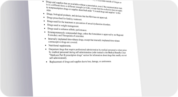 • Drugs prescribed for an indication if the FDA has not approved the drug for that indication, except that this exclusion does not apply if our Regional Formulary and Therapeutics Committee determines that the drug is recognized as effective for that use (i) in one of the standard reference compendia, or (ii) in the majority of relevant peer-reviewed medical literature, or (iii) by the Secretary of the U.S. Department of Health and Human Services. • Drugs and supplies ordered from the mail-order pharmacy to addresses outside of Oregon or Washington. • Drugs and supplies that are available without a prescription, even if the nonprescription item is in a different form or different strength (or both), except that this exclusion does not apply to nonprescription drugs or supplies described under "Covered drugs and supplies" in this rider. • Drugs, biological products, and devices that the FDA has not approved. • Drugs prescribed for fertility treatment. • Drugs used for the treatment or prevention of sexual dysfunction disorders. • Drugs used in weight management. • Drugs used to enhance athletic performance. • Extemporaneously compounded drugs, unless the formulation is approved by our Regional Formulary and Therapeutics Committee. • Internally implanted time-release drugs, except that internally implanted time-release contraceptive drugs are covered. • Nutritional supplements. • Outpatient drugs that require professional administration by medical personnel or observation by medical personnel during self-administration (refer instead to the Medical Benefits Chart "Medicare Part B prescription drugs" section for information about drugs that usually are not self-administered). • Replacement of drugs and supplies due to loss, damage, or carelessness. RSARX0124 6
