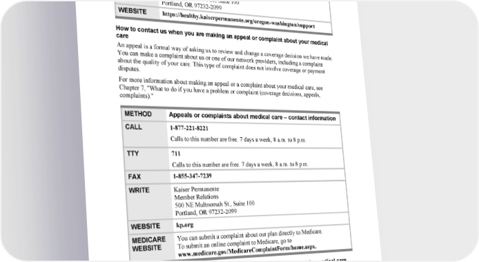 30 2024 Evidence of Coverage for WA PEBB Kaiser Permanente Senior Advantage Chapter 2: Important phone numbers and resources METHOD Coverage decisions about medical care – contact information WRITE Kaiser Permanente Attn: Utilization Management 500 NE Multnomah St., Suite 100 Portland, OR 97232-2099 WEBSITE https://healthy.kaiserpermanente.org/oregon-washington/support How to contact us when you are making an appeal or complaint about your medical care An appeal is a formal way of asking us to review and change a coverage decision we have made. You can make a complaint about us or one of our network providers, including a complaint about the quality of your care. This type of complaint does not involve coverage or payment disputes. For more information about making an appeal or a complaint about your medical care, see Chapter 7, "What to do if you have a problem or complaint (coverage decisions, appeals, complaints)." METHOD Appeals or complaints about medical care – contact information CALL 1-877-221-8221 Calls to this number are free. 7 days a week, 8 a.m. to 8 p.m. TTY 711 Calls to this number are free. 7 days a week, 8 a.m. to 8 p.m. FAX 1-855-347-7239 WRITE Kaiser Permanente Member Relations 500 NE Multnomah St., Suite 100 Portland, OR 97232-2099 WEBSITE kp.org MEDICARE You can submit a complaint about our plan directly to Medicare. WEBSITE To submit an online complaint to Medicare, go to www.medicare.gov/MedicareComplaintForm/home.aspx. Where to send a request asking us to pay for our share of the cost for medical care you have received If you have received a bill or paid for services (such as a provider bill) that you think we should pay for, you may need to ask us for reimbursement or to pay the provider bill. See Chapter 5, "Asking us to pay our share of a bill you have received for covered medical services." kp.org