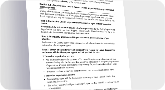 2024 Evidence of Coverage for WA PEBB Kaiser Permanente Senior Advantage 83 Chapter 7: What to do if you have a problem or complaint (coverage decisions, appeals, complaints) Step 4: If the answer to your Level 1 appeal is no, you decide if you want to make another appeal. If the Quality Improvement Organization has said no to your appeal, and you stay in the hospital after your planned discharge date, then you can make another appeal. Making another appeal means you are going on to Level 2 of the appeals process. Section 6.3 – Step-by-step: How to make a Level 2 appeal to change your hospital discharge date During a Level 2 appeal, you ask the Quality Improvement Organization to take another look at their decision on your first appeal. If the Quality Improvement Organization turns down your Level 2 appeal, you may have to pay the full cost for your stay after your planned discharge date. Step 1: Contact the Quality Improvement Organization again and ask for another review. You must ask for this review within 60 calendar days after the day the Quality Improvement Organization said no to your Level 1 appeal. You can ask for this review only if you stay in the hospital after the date that your coverage for the care ended. Step 2: The Quality Improvement Organization does a second review of your situation. Reviewers at the Quality Improvement Organization will take another careful look at all of the information related to your appeal. Step 3: Within 14 calendar days of receipt of your request for a Level 2 appeal, the reviewers will decide on your appeal and tell you their decision. If the review organization says yes: • We must reimburse you for our share of the costs of hospital care you have received since noon on the day after the date your first appeal was turned down by the Quality Improvement Organization. We must continue providing coverage for your inpatient hospital care for as long as it is medically necessary. • You must continue to pay your share of the costs and coverage limitations may apply. If the review organization says no: • It means they agree with the decision they made on your Level 1 appeal. This is called upholding the decision. • The notice you get will tell you in writing what you can do if you wish to continue with the review process. Step 4: If the answer is no, you will need to decide whether you want to take your appeal further by going on to Level 3. • There are three additional levels in the appeals process after Level 2 (for a total of five levels of appeal). If you want to go to a Level 3 appeal, the details on how to do this are in the written notice you get after your Level 2 appeal decision. 1-877-221-8221 (TTY 711), 7 days a week, 8 a.m. to 8 p.m.