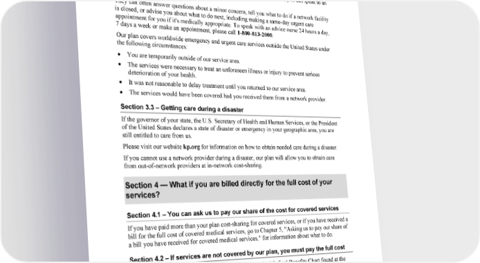 46 2024 Evidence of Coverage for WA PEBB Kaiser Permanente Senior Advantage Chapter 3: Using our plan for your medical services We know that sometimes it's difficult to know what type of care you need. That's why we have telephone advice nurses available to assist you. Our advice nurses are registered nurses specially trained to help assess medical symptoms and provide advice over the phone, when medically appropriate. Whether you are calling for advice or to make an appointment, you can speak to an advice nurse. They can often answer questions about a minor concern, tell you what to do if a network facility is closed, or advise you about what to do next, including making a same-day urgent care appointment for you if it's medically appropriate. To speak with an advice nurse 24 hours a day, 7 days a week or make an appointment, please call 1-800-813-2000. Our plan covers worldwide emergency and urgent care services outside the United States under the following circumstances: • You are temporarily outside of our service area. • The services were necessary to treat an unforeseen illness or injury to prevent serious deterioration of your health. • It was not reasonable to delay treatment until you returned to our service area. • The services would have been covered had you received them from a network provider. Section 3.3 – Getting care during a disaster If the governor of your state, the U.S. Secretary of Health and Human Services, or the President of the United States declares a state of disaster or emergency in your geographic area, you are still entitled to care from us. Please visit our website kp.org for information on how to obtain needed care during a disaster. If you cannot use a network provider during a disaster, our plan will allow you to obtain care from out-of-network providers at in-network cost-sharing. Section 4 — What if you are billed directly for the full cost of your services? Section 4.1 – You can ask us to pay our share of the cost for covered services If you have paid more than your plan cost-sharing for covered services, or if you have received a bill for the full cost of covered medical services, go to Chapter 5, "Asking us to pay our share of a bill you have received for covered medical services," for information about what to do. Section 4.2 – If services are not covered by our plan, you must pay the full cost We cover all medically necessary services as listed in the Medical Benefits Chart found at the front of this EOC. If you receive services not covered by our plan or services obtained out-of- network and were not authorized, you are responsible for paying the full cost of services. For covered services that have a benefit limitation, you also pay the full cost of any services you get after you have used up your benefit for that type of covered service. Any amounts you pay after the benefit has been exhausted will not count toward the maximum out-of-pocket amount. kp.org