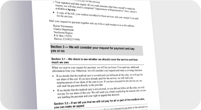 62 2024 Evidence of Coverage for WA PEBB Kaiser Permanente Senior Advantage Chapter 5: Asking us to pay our share of a bill you have received for covered medical services o The date you received the services. o Where you received the services. o Who provided the services. o Why you think we should pay for the services. o Your signature and date signed. (If you want someone other than yourself to make the request, we will also need a completed "Appointment of Representative" form, which is available at kp.org.) ♦ A copy of the bill, your medical record(s) for these services, and your receipt if you paid for the services. Mail your request for payment together with any bills or paid receipts to us at this address: Kaiser Permanente Claims Department Northwest Region P.O. Box 370050 Denver, CO 80237-9998 Section 3 — We will consider your request for payment and say yes or no Section 3.1 – We check to see whether we should cover the service and how much we owe When we receive your request for payment, we will let you know if we need any additional information from you. Otherwise, we will consider your request and make a coverage decision. • If we decide that the medical care is covered and you followed all the rules, we will pay for our share of the cost. If you have already paid for the service, we will mail your reimbursement of our share of the cost to you. If you have not paid for the service yet, we will mail the payment directly to the provider. • If we decide that the medical care is not covered, or you did not follow all the rules, we will not pay for our share of the cost. We will send you a letter explaining the reasons why we are not sending the payment and your right to appeal that decision. Section 3.2 – If we tell you that we will not pay for all or part of the medical care, you can make an appeal If you think we have made a mistake in turning down your request for payment or the amount we are paying, you can make an appeal. If you make an appeal, it means you are asking us to change the decision we made when we turned down your request for payment. The appeals process is a formal process with detailed procedures and important deadlines. For the details on how to make this appeal, go to Chapter 7 of this document. kp.org