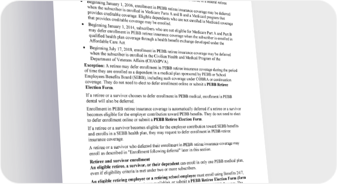 2024 Evidence of Coverage for WA PEBB Kaiser Permanente Senior Advantage 11 Chapter 1: Getting started as a member or the dependent of an employee, or such medical insurance continued under Consolidated Omnibus Budget Reconciliation Act (COBRA) coverage or continuation coverage. • Beginning January 1, 2001, enrollment in PEBB retiree insurance coverage may be deferred when the subscriber is enrolled as a retiree or the dependent of a retiree in a federal retiree medical plan. • Beginning January 1, 2006, enrollment in PEBB retiree insurance coverage may be deferred when the subscriber is enrolled in Medicare Parts A and B and a Medicaid program that provides creditable coverage. Eligible dependents who are not enrolled in Medicaid coverage that provides creditable coverage may be enrolled. • Beginning January 1, 2014, subscribers who are not eligible for Medicare Part A and Part B may defer enrollment in PEBB retiree insurance coverage when the subscriber is enrolled in qualified health plan coverage through a health benefit exchange developed under the Affordable Care Act. • Beginning July 17, 2018, enrollment in PEBB retiree insurance coverage may be deferred when the subscriber is enrolled in the Civilian Health and Medical Program of the Department of Veterans Affairs (CHAMPVA). Exception: A retiree may defer enrollment in PEBB retiree insurance coverage during the period of time they are enrolled as a dependent in a medical plan sponsored by PEBB or School Employees Benefits Board (SEBB), including such coverage under COBRA or continuation coverage. They do not need to elect to defer enrollment online or submit a PEBB Retiree Election Form. If a retiree or a survivor chooses to defer enrollment in PEBB medical, enrollment in PEBB dental will also be deferred. Enrollment in PEBB retiree insurance coverage is automatically deferred if a retiree or a survivor becomes eligible for the employer contribution toward PEBB benefits. They do not need to elect to defer enrollment online or submit a PEBB Retiree Election Form. If a retiree or a survivor becomes eligible for the employer contribution toward SEBB benefits and enrolls in a SEBB health plan, they may request to defer enrollment in PEBB retiree insurance coverage. A retiree or a survivor who deferred their enrollment in PEBB retiree insurance coverage may enroll as described in "Enrollment following deferral" later in this section. Retiree and survivor enrollment An eligible retiree, a survivor, or their dependent can enroll in only one PEBB medical plan, even if eligibility criteria is met under two or more subscribers. An eligible retiring employee or a retiring school employee must enroll using Benefits 24/7, the online enrollment system (once available), or submit a PEBB Retiree Election Form (form A) along with any other required forms and supporting documents to the PEBB Program. The online enrollment must be completed or the forms must be received no later than 60 days after the employee's or the school employee's own employer-paid coverage, COBRA coverage, or continuation coverage ends. The first premium payment and applicable premium surcharges are due to HCA no later than 45 days after the election period ends. 1-877-221-8221 (TTY 711), 7 days a week, 8 a.m. to 8 p.m.