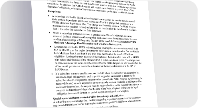 18 2024 Evidence of Coverage for WA PEBB Kaiser Permanente Senior Advantage Chapter 1: Getting started as a member To disenroll from a Medicare Advantage (MA) plan or Medicare Advantage-Prescription Drug (MAPD) plan, the change in enrollment must be allowable under federal regulations. To make an enrollment change, the subscriber must submit the change online using Benefits 24/7 (once available) or submit the required PEBB Retiree Change Form (form E) along with any other required forms to the PEBB Program. The change must be completed online or the PEBB Program must receive the forms no later than 60 days after the event that creates the special open enrollment. In addition, the PEBB Program will require the subscriber to provide proof of the dependent's eligibility, evidence of the event that created the special open enrollment, or both. Exceptions: • A subscriber enrolled in PEBB retiree insurance coverage has six months from the date of their or their dependent's enrollment in Medicare Part B to change their enrollment to a PEBB Medicare Supplement Plan. The change must be made online or the PEBB Program must receive the required form(s) no later than six months after the enrollment in Medicare Part B for either the subscriber or their dependent. • When a subscriber or their dependent is enrolled in an MA or MAPD plan, they may disenroll during a special enrollment period as allowed under federal regulations. The new medical plan coverage will begin the first day of the month following the date the PEBB Medicare Advantage Plan Disenrollment Form (form D) is received. • A subscriber enrolled in PEBB retiree insurance coverage has seven months to enroll in an MA or MAPD plan that begins three months before they or their dependent first enrolled in both Medicare Part A and Part B and ends three months after the month of Medicare eligibility. A subscriber may also enroll themselves or their dependent in an MA or MAPD plan before their last day of the Medicare Part B initial enrollment period. The change must be made online or the forms must be received by the PEBB Program no later than the last day of the month prior to the month the subscriber or their dependent enrolls in the MA or MAPD plan. • If a subscriber wants to enroll a newborn or child whom the subscriber has adopted or has assumed a legal obligation for total or partial support in anticipation of adoption, the subscriber should complete the request online or notify the PEBB Program by submitting the required form(s) as soon as possible to ensure timely payment of claims. If adding the child increases the premium, the request must be received online, or the required form(s) must be received no later than 60 days after the date of the birth, adoption, or the date the legal obligation is assumed for total or partial support in anticipation of adoption. Special open enrollment events that allow for a change in health plans A subscriber may not change their health plan during a special open enrollment if their state- registered domestic partner or state-registered domestic partner's child is not a tax dependent. Any of the following events may create a special open enrollment: • Subscriber gains a new dependent due to: ♦ Marriage or registering a state-registered domestic partnership. ♦ Birth, adoption, or assuming a legal obligation for total or partial support in anticipation of adoption. kp.org