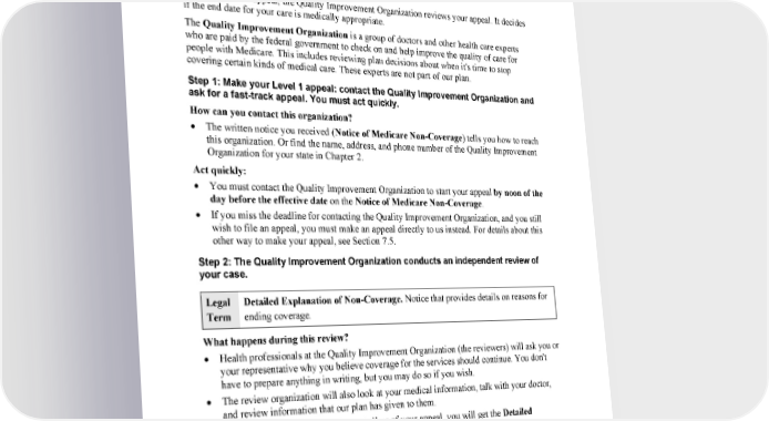 2024 Evidence of Coverage for WA PEBB Kaiser Permanente Senior Advantage 87 Chapter 7: What to do if you have a problem or complaint (coverage decisions, appeals, complaints) • Ask for help if you need it. If you have questions or need help at any time, please call Member Services. Or call your State Health Insurance Assistance Program, a government organization that provides personalized assistance. During a Level 1 appeal, the Quality Improvement Organization reviews your appeal. It decides if the end date for your care is medically appropriate. The Quality Improvement Organization is a group of doctors and other health care experts who are paid by the federal government to check on and help improve the quality of care for people with Medicare. This includes reviewing plan decisions about when it's time to stop covering certain kinds of medical care. These experts are not part of our plan. Step 1: Make your Level 1 appeal: contact the Quality Improvement Organization and ask for a fast-track appeal. You must act quickly. How can you contact this organization? • The written notice you received (Notice of Medicare Non-Coverage) tells you how to reach this organization. Or find the name, address, and phone number of the Quality Improvement Organization for your state in Chapter 2. Act quickly: • You must contact the Quality Improvement Organization to start your appeal by noon of the day before the effective date on the Notice of Medicare Non-Coverage. • If you miss the deadline for contacting the Quality Improvement Organization, and you still wish to file an appeal, you must make an appeal directly to us instead. For details about this other way to make your appeal, see Section 7.5. Step 2: The Quality Improvement Organization conducts an independent review of your case. Legal Detailed Explanation of Non-Coverage. Notice that provides details on reasons for Term ending coverage. What happens during this review? • Health professionals at the Quality Improvement Organization (the reviewers) will ask you or your representative why you believe coverage for the services should continue. You don't have to prepare anything in writing, but you may do so if you wish. • The review organization will also look at your medical information, talk with your doctor, and review information that our plan has given to them. • By the end of the day the reviewers tell us of your appeal, you will get the Detailed Explanation of Non-Coverage from us that explains in detail our reasons for ending our coverage for your services. 1-877-221-8221 (TTY 711), 7 days a week, 8 a.m. to 8 p.m.