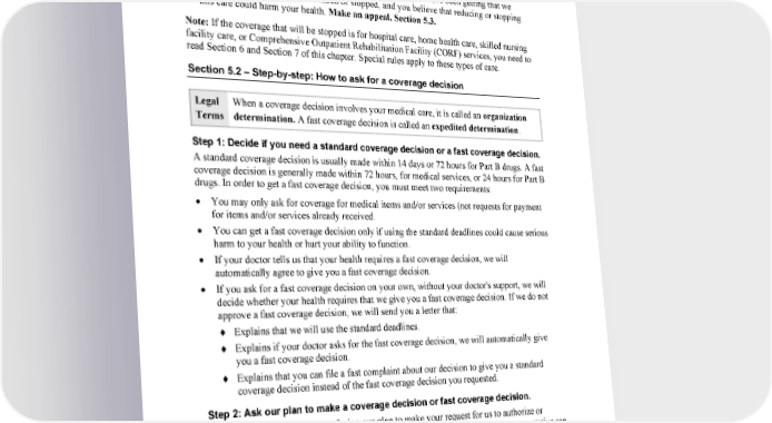74 2024 Evidence of Coverage for WA PEBB Kaiser Permanente Senior Advantage Chapter 7: What to do if you have a problem or complaint (coverage decisions, appeals, complaints) • You have received and paid for medical care that you believe should be covered by our plan, and you want to ask us to reimburse you for this care. Send us the bill. Section 5.5. • You are being told that coverage for certain medical care you have been getting that we previously approved will be reduced or stopped, and you believe that reducing or stopping this care could harm your health. Make an appeal. Section 5.3. Note: If the coverage that will be stopped is for hospital care, home health care, skilled nursing facility care, or Comprehensive Outpatient Rehabilitation Facility (CORF) services, you need to read Section 6 and Section 7 of this chapter. Special rules apply to these types of care. Section 5.2 – Step-by-step: How to ask for a coverage decision Legal When a coverage decision involves your medical care, it is called an organization Terms determination. A fast coverage decision is called an expedited determination. Step 1: Decide if you need a standard coverage decision or a fast coverage decision. A standard coverage decision is usually made within 14 days or 72 hours for Part B drugs. A fast coverage decision is generally made within 72 hours, for medical services, or 24 hours for Part B drugs. In order to get a fast coverage decision, you must meet two requirements: • You may only ask for coverage for medical items and/or services (not requests for payment for items and/or services already received. • You can get a fast coverage decision only if using the standard deadlines could cause serious harm to your health or hurt your ability to function. • If your doctor tells us that your health requires a fast coverage decision, we will automatically agree to give you a fast coverage decision. • If you ask for a fast coverage decision on your own, without your doctor's support, we will decide whether your health requires that we give you a fast coverage decision. If we do not approve a fast coverage decision, we will send you a letter that: ♦ Explains that we will use the standard deadlines. ♦ Explains if your doctor asks for the fast coverage decision, we will automatically give you a fast coverage decision. ♦ Explains that you can file a fast complaint about our decision to give you a standard coverage decision instead of the fast coverage decision you requested. Step 2: Ask our plan to make a coverage decision or fast coverage decision. • Start by calling, writing, or faxing our plan to make your request for us to authorize or provide coverage for the medical care you want. You, your doctor, or your representative can do this. Chapter 2 has contact information. Step 3: We consider your request for medical care coverage and give you our answer. For standard coverage decisions, we use the standard deadlines. kp.org