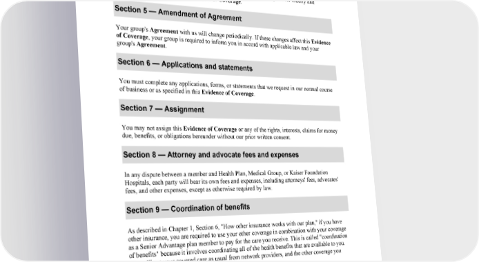 2024 Evidence of Coverage for WA PEBB Kaiser Permanente Senior Advantage 101 Chapter 9: Legal notices Section 4 — Administration of this Evidence of Coverage We may adopt reasonable policies, procedures, and interpretations to promote orderly and efficient administration of this Evidence of Coverage. Section 5 — Amendment of Agreement Your group's Agreement with us will change periodically. If these changes affect this Evidence of Coverage, your group is required to inform you in accord with applicable law and your group's Agreement. Section 6 — Applications and statements You must complete any applications, forms, or statements that we request in our normal course of business or as specified in this Evidence of Coverage. Section 7 — Assignment You may not assign this Evidence of Coverage or any of the rights, interests, claims for money due, benefits, or obligations hereunder without our prior written consent. Section 8 — Attorney and advocate fees and expenses In any dispute between a member and Health Plan, Medical Group, or Kaiser Foundation Hospitals, each party will bear its own fees and expenses, including attorneys' fees, advocates' fees, and other expenses, except as otherwise required by law. Section 9 — Coordination of benefits As described in Chapter 1, Section 6, "How other insurance works with our plan," if you have other insurance, you are required to use your other coverage in combination with your coverage as a Senior Advantage plan member to pay for the care you receive. This is called "coordination of benefits" because it involves coordinating all of the health benefits that are available to you. You will get your covered care as usual from network providers, and the other coverage you have will simply help pay for the care you receive. If your other coverage is the primary payer, it will often settle its share of payment directly with us, and you will not have to be involved. However, if payment owed to us by a primary payer is sent directly to you, you are required by Medicare law to give this primary payment to us. For more information about primary payments in third party liability situations, see Section 17 in this 1-877-221-8221 (TTY 711), 7 days a week, 8 a.m. to 8 p.m.