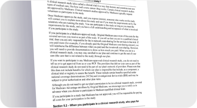 2024 Evidence of Coverage for WA PEBB Kaiser Permanente Senior Advantage 47 Chapter 3: Using our plan for your medical services Section 5 — How are your medical services covered when you are in a clinical research study? Section 5.1 – What is a clinical research study? A clinical research study (also called a clinical trial) is a way that doctors and scientists test new types of medical care, like how well a new cancer drug works. Certain clinical research studies are approved by Medicare. Clinical research studies approved by Medicare typically request volunteers to participate in the study. Once Medicare approves the study, and you express interest, someone who works on the study will contact you to explain more about the study and see if you meet the requirements set by the scientists who are running the study. You can participate in the study as long as you meet the requirements for the study, and you have a full understanding and acceptance of what is involved if you participate in the study. If you participate in a Medicare-approved study, Original Medicare pays most of the costs for the covered services you receive as part of the study. If you tell us that you are in a qualified clinical trial, then you are only responsible for the in-network cost-sharing for the services in that trial. If you paid more (for example, if you already paid the Original Medicare cost-sharing amount), we will reimburse the difference between what you paid and the in-network cost-sharing. However, you will need to provide documentation to show us how much you paid. When you are in a clinical research study, you may stay enrolled in our plan and continue to get the rest of your care (the care that is not related to the study) through our plan. If you want to participate in any Medicare-approved clinical research study, you do not need to tell us or to get approval from us or your PCP. The providers that deliver your care as part of the clinical research study do not need to be part of our plan's network of providers. Please note that this does not include benefits for which our plan is responsible that include, as a component, a clinical trial or registry to assess the benefit. These include certain benefits specified under national coverage determinations (NCDs) and investigational device trials (IDE) and may be subject to prior authorization and other plan rules. Although you do not need to get our plan's permission to be in a clinical research study, covered for Medicare Advantage enrollees by Original Medicare, we encourage you to notify us in advance when you choose to participate in Medicare-qualified clinical trials. If you participate in a study that Medicare has not approved, you will be responsible for paying all costs for your participation in the study. Section 5.2 – When you participate in a clinical research study, who pays for what? Once you join a Medicare-approved clinical research study, Original Medicare covers the routine items and services you receive as part of the study, including: • Room and board for a hospital stay that Medicare would pay for even if you weren't in a study. • An operation or other medical procedure if it is part of the research study. 1-877-221-8221 (TTY 711), 7 days a week, 8 a.m. to 8 p.m.