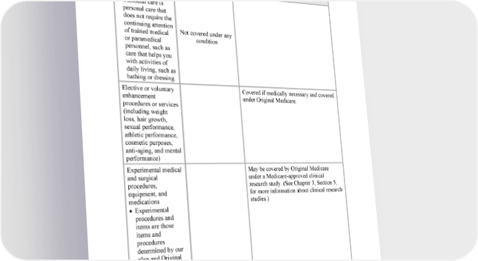 2024 Evidence of Coverage for WA PEBB Kaiser Permanente Senior Advantage 55 Chapter 4: Medical Benefits Chart (what is covered and what you pay) Services not Not covered under Covered only under specific covered by any condition conditions Medicare Custodial care • Custodial care is personal care that does not require the continuing attention Not covered under any of trained medical condition or paramedical personnel, such as care that helps you with activities of daily living, such as bathing or dressing. Elective or voluntary Covered if medically necessary and covered enhancement under Original Medicare. procedures or services (including weight loss, hair growth, sexual performance, athletic performance, cosmetic purposes, anti-aging, and mental performance) Experimental medical May be covered by Original Medicare and surgical under a Medicare-approved clinical procedures, research study. (See Chapter 3, Section 5, equipment, and for more information about clinical research medications studies.) • Experimental procedures and items are those items and procedures determined by our plan and Original Medicare to not be generally accepted by the medical community. 1-877-221-8221 (TTY 711), 7 days a week, 8 a.m. to 8 p.m.