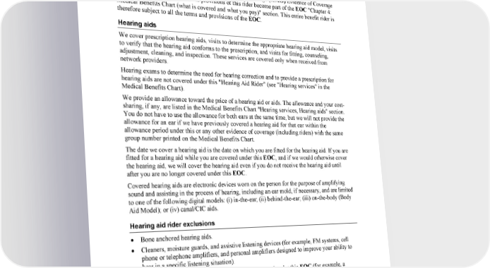 Hearing Aid Rider Kaiser Permanente Senior Advantage ( HMO) This rider is part of the Kaiser Permanente Senior Advantage (HMO) Evidence of Coverage (EOC) to which it is attached. All provisions of this rider become part of the EOC "Chapter 4: Medical Benefits Chart (what is covered and what you pay)" section. This entire benefit rider is therefore subject to all the terms and provisions of the EOC. Hearing aids We cover prescription hearing aids, visits to determine the appropriate hearing aid model, visits to verify that the hearing aid conforms to the prescription, and visits for fitting, counseling, adjustment, cleaning, and inspection. These services are covered only when received from network providers. Hearing exams to determine the need for hearing correction and to provide a prescription for hearing aids are not covered under this "Hearing Aid Rider" (see "Hearing services" in the Medical Benefits Chart). We provide an allowance toward the price of a hearing aid or aids. The allowance and your cost- sharing, if any, are listed in the Medical Benefits Chart "Hearing services, Hearing aids" section. You do not have to use the allowance for both ears at the same time, but we will not provide the allowance for an ear if we have previously covered a hearing aid for that ear within the allowance period under this or any other evidence of coverage (including riders) with the same group number printed on the Medical Benefits Chart. The date we cover a hearing aid is the date on which you are fitted for the hearing aid. If you are fitted for a hearing aid while you are covered under this EOC, and if we would otherwise cover the hearing aid, we will cover the hearing aid even if you do not receive the hearing aid until after you are no longer covered under this EOC. Covered hearing aids are electronic devices worn on the person for the purpose of amplifying sound and assisting in the process of hearing, including an ear mold, if necessary, and are limited to one of the following digital models: (i) in-the-ear; (ii) behind-the-ear; (iii) on-the-body (Body Aid Model); or (iv) canal/CIC aids. Hearing aid rider exclusions • Bone anchored hearing aids. • Cleaners, moisture guards, and assistive listening devices (for example, FM systems, cell phone or telephone amplifiers, and personal amplifiers designed to improve your ability to hear in a specific listening situation). • Hearing aids that were fitted before you were covered under this EOC (for example, a hearing aid that was fitted during the previous contract year will not be covered under this EOC, though it might be covered under your evidence of coverage for the previous contract year). • Internally implanted hearing aids. • Non-prescription hearing aids. RSAHA0124 1