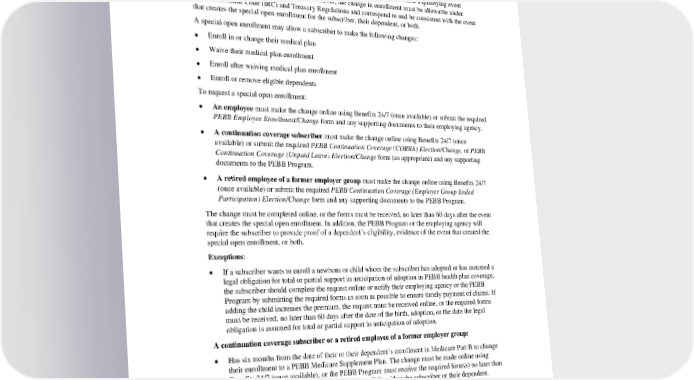 Group Ended Participation) Election/Change form and any supporting documents to the PEBB Program. The change must be completed online, or the forms received, no later than the last day of the annual open enrollment period and will be effective January 1 of the following year. 5. Special Open Enrollment changes. A subscriber may change their enrollment outside of the annual open enrollment if a qualifying event creates a special open enrollment period. However, the change in enrollment must be allowable under Internal Revenue Code (IRC) and Treasury Regulations and correspond to and be consistent with the event that creates the special open enrollment for the subscriber, their dependent, or both. A special open enrollment may allow a subscriber to make the following changes: Enroll in or change their medical plan • Waive their medical plan enrollment • Enroll after waiving medical plan enrollment • Enroll or remove eligible dependents • To request a special open enrollment: • An employee must make the change online using Benefits 24/7 (once available) or submit the required PEBB Employee Enrollment/Change form and any supporting documents to their employing agency. • A continuation coverage subscriber must make the change online using Benefits 24/7 (once available) or submit the required PEBB Continuation Coverage (COBRA) Election/Change, or PEBB Continuation Coverage (Unpaid Leave) Election/Change form (as appropriate) and any supporting documents to the PEBB Program. • A retired employee of a former employer group must make the change online using Benefits 24/7 (once available) or submit the required PEBB Continuation Coverage (Employer Group Ended Participation) Election/Change form and any supporting documents to the PEBB Program. The change must be completed online, or the forms must be received, no later than 60 days after the event that creates the special open enrollment. In addition, the PEBB Program or the employing agency will require the subscriber to provide proof of a dependent’s eligibility, evidence of the event that created the special open enrollment, or both. Exceptions: • If a subscriber wants to enroll a newborn or child whom the subscriber has adopted or has assumed a legal obligation for total or partial support in anticipation of adoption in PEBB health plan coverage, the subscriber should complete the request online or notify their employing agency or the PEBB Program by submitting the required forms as soon as possible to ensure timely payment of claims. If adding the child increases the premium, the request must be received online, or the required forms must be received, no later than 60 days after the date of the birth, adoption, or the date the legal obligation is assumed for total or partial support in anticipation of adoption. A continuation coverage subscriber or a retired employee of a former employer group: • Has six months from the date of their or their dependent’s enrollment in Medicare Part B to change their enrollment to a PEBB Medicare Supplement Plan. The change must be made online using Benefits 24/7 (once available), or the PEBB Program must receive the required form(s) no later than six months after the enrollment in Medicare Part B for either the subscriber or their dependent. • When they or their dependent is enrolled in a Medicare Advantage (MA) or Medicare Advantage- Prescription Drug (MAPD) plan, they may disenroll during a special enrollment period as allowed under federal regulations. The new medical plan coverage will begin the first day of the month following the date the PEBB Medicare Advantage Plan Disenrollment form (form D) is received. PEBB HMOHSA 2024 55