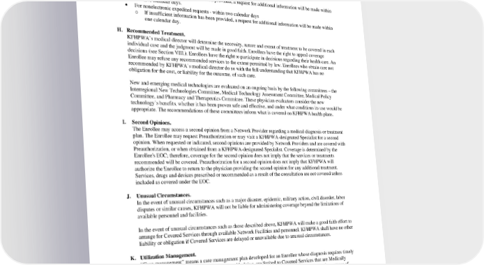 o If insufficient information has been provided, a request for additional information will be made within one calendar day. • For electronic expedited prior authorization requests – within one calendar day o If insufficient information has been provided, a request for additional information will be made within one calendar day. • For nonelectronic standard requests – within five calendar days o If insufficient information has been provided, a request for additional information will be made within five calendar days. • For nonelectronic expedited requests - within two calendar days o If insufficient information has been provided, a request for additional information will be made within one calendar day. H. Recommended Treatment. KFHPWA’s medical director will determine the necessity, nature and extent of treatment to be covered in each individual case and the judgment will be made in good faith. Enrollees have the right to appeal coverage decisions (see Section VIII.). Enrollees have the right to participate in decisions regarding their health care. An Enrollee may refuse any recommended services to the extent permitted by law. Enrollees who obtain care not recommended by KFHPWA’s medical director do so with the full understanding that KFHPWA has no obligation for the cost, or liability for the outcome, of such care. New and emerging medical technologies are evaluated on an ongoing basis by the following committees – the Interregional New Technologies Committee, Medical Technology Assessment Committee, Medical Policy Committee, and Pharmacy and Therapeutics Committee. These physician evaluators consider the new technology’s benefits, whether it has been proven safe and effective, and under what conditions its use would be appropriate. The recommendations of these committees inform what is covered on KFHPWA health plans. I. Second Opinions. The Enrollee may access a second opinion from a Network Provider regarding a medical diagnosis or treatment plan. The Enrollee may request Preauthorization or may visit a KFHPWA-designated Specialist for a second opinion. When requested or indicated, second opinions are provided by Network Providers and are covered with Preauthorization, or when obtained from a KFHPWA-designated Specialist. Coverage is determined by the Enrollee's EOC; therefore, coverage for the second opinion does not imply that the services or treatments recommended will be covered. Preauthorization for a second opinion does not imply that KFHPWA will authorize the Enrollee to return to the physician providing the second opinion for any additional treatment. Services, drugs and devices prescribed or recommended as a result of the consultation are not covered unless included as covered under the EOC. J. Unusual Circumstances. In the event of unusual circumstances such as a major disaster, epidemic, military action, civil disorder, labor disputes or similar causes, KFHPWA will not be liable for administering coverage beyond the limitations of available personnel and facilities. In the event of unusual circumstances such as those described above, KFHPWA will make a good faith effort to arrange for Covered Services through available Network Facilities and personnel. KFHPWA shall have no other liability or obligation if Covered Services are delayed or unavailable due to unusual circumstances. K. Utilization Management. “Case management” means a care management plan developed for an Enrollee whose diagnosis requires timely coordination. All benefits, including travel and lodging, are limited to Covered Services that are Medically Necessary and set forth in the EOC. KFHPWA may review an Enrollee's medical records for the purpose of verifying delivery and coverage of services and items. Based on a prospective, concurrent or retrospective review, KFHPWA may deny coverage if, in its determination, such services are not Medically Necessary. Such determination shall be based on established clinical criteria and may require Preauthorization. KFHPWA will not deny coverage retroactively for services with Preauthorization and which have already been provided to the Enrollee except in the case of an intentional misrepresentation of a material fact by the patient, PEBB HMOHSA 2024 10