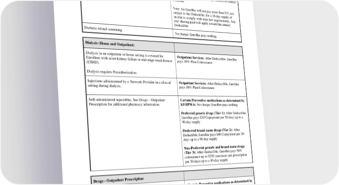 coinsurance up to $250 maximum per prescription per 30-days up to a 90-day supply Annual Deductible does not apply to strip-based blood glucose monitors, test strips, lancets or control solutions. Note: An Enrollee will not pay more than $35, not subject to the Deductible, for a 30-day supply of insulin to comply with state law requirements. Any cost sharing paid will apply toward the annual Deductible. Diabetic retinal screening. No charge; Enrollee pays nothing Dialysis (Home and Outpatient) Dialysis in an outpatient or home setting is covered for Outpatient Services: After Deductible, Enrollee Enrollees with acute kidney failure or end-stage renal disease pays 10% Plan Coinsurance (ESRD). Dialysis requires Preauthorization. Injections administered by a Network Provider in a clinical Outpatient Services: After Deductible, Enrollee setting during dialysis. pays 10% Plan Coinsurance Self-administered injectables. See Drugs – Outpatient Certain Preventive medications as determined by Prescription for additional pharmacy information. KFHPWA: No charge; Enrollee pays nothing Preferred generic drugs (Tier 1): After Deductible, Enrollee pays $20 Copayment per 30-days up to a 90-day supply Preferred brand name drugs (Tier 2): After Deductible, Enrollee pays $40 Copayment per 30- days up to a 90-day supply Non-Preferred generic and brand name drugs (Tier 3): After Deductible, Enrollee pays 50% coinsurance up to $250 maximum per prescription per 30-days up to a 90-day supply Drugs - Outpatient Prescription Prescription drugs, supplies and devices for a supply of 30 Certain Preventive medications as determined by days or less including diabetic pharmacy supplies (insulin, KFHPWA: No charge; Enrollee pays nothing lancets, lancet devices, needles, insulin syringes, disposable insulin pens, pen needles and blood glucose test strips), Preferred generic drugs (Tier 1): After Deductible, mental health and wellness drugs, self-administered Enrollee pays $20 Copayment per 30-days up to a injectables, medications for the treatment arising from sexual 90-day supply assault, and routine costs for prescription medications PEBB HMOHSA 2024 19