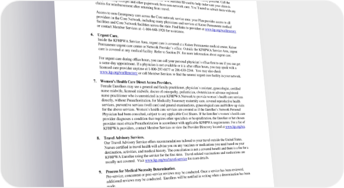 is not an emergency. Examples include, but are not limited to minor injuries, wounds, and cuts needing stiches; minor breathing issues; minor stomach pain. If you are unsure whether urgent care is your best option, call the consulting nurse helpline for advice at 1-800-297-6877 or 206-630-2244. If you need Emergency care while traveling and are admitted to a non-network hospital, you or a family member must notify us within 24 hours after care begins, or as soon as is reasonably possible. Call the notification line listed on the back of your KFHPWA Member ID card to help make sure your claim is accepted. Keep receipts and other paperwork from non-network care. You’ll need to submit them with any claims for reimbursement after returning from travel. Access to non-Emergency care across the Core network service area: your Plan provides access to all providers in the Core Network, including many physicians and services at Kaiser Permanente medical facilities and Core Network facilities across the state. Find links to providers at www.kp.org/wa/directory or contact Member Services at -1-866-648-1928 for assistance. 6. Urgent Care. Inside the KFHPWA Service Area, urgent care is covered at a Kaiser Permanente medical center, Kaiser Permanente urgent care center or Network Provider’s office. Outside the KFHPWA Service Area, urgent care is covered at any medical facility. Refer to Section IV. for more information about urgent care. For urgent care during office hours, you can call your personal physician’s office first to see if you can get a same-day appointment. If a physician is not available or it is after office hours, you may speak with a licensed care provider anytime at 1-800-297-6877 or 206-630-2244. You may also check www.kp.org/wa/directory or call Member Services to find the nearest urgent care facility in your network. 7. Women’s Health Care Direct Access Providers. Female Enrollees may see a general and family practitioner, physician’s assistant, gynecologist, certified nurse midwife, licensed midwife, doctor of osteopathy, pediatrician, obstetrician or advance registered nurse practitioner who is unrestricted in your KFHPWA Network to provide women’s health care services directly, without Preauthorization, for Medically Necessary maternity care, covered reproductive health services, preventive services (well care) and general examinations, gynecological care and follow-up visits for the above services. Women’s health care services are covered as if the Enrollee’s Network Personal Physician had been consulted, subject to any applicable Cost Shares. If the Enrollee’s women’s health care provider diagnoses a condition that requires other specialists or hospitalization, the Enrollee or her chosen provider must obtain Preauthorization in accordance with applicable KFHPWA requirements. For a list of KFHPWA providers, contact Member Services or view the Provider Directory located at www.kp.org/wa. 8. Travel Advisory Services. Our Travel Advisory Service offers recommendations tailored to your travel outside the United States. Nurses certified in travel health will advise you on any vaccines or medications you need based on your destination, activities, and medical history. The consultation is not a covered benefit and there is a fee for a KFHPWA Enrollee using the service for the first time. Travel-related vaccinations and medications are usually not covered. Visit www.kp.org/wa/travel-service for more details. 9. Process for Medical Necessity Determination. Pre-service, concurrent or post-service reviews may be conducted. Once a service has been reviewed, additional reviews may be conducted. Enrollees will be notified in writing when a determination has been made. First Level Review: First level reviews are performed or overseen by appropriate clinical staff using KFHPWA approved clinical review criteria. Data sources for the review include, but are not limited to, referral forms, admission request forms, the Enrollee’s medical record, and consultation with qualified health professionals and multidisciplinary health care team members. The clinical information used in the review may include treatment summaries, problem lists, specialty evaluations, laboratory and x-ray results, and rehabilitation PEBB HMOHSA 2024 8
