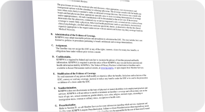 service documentation. The Enrollee or legal surrogate may be contacted for information. Coordination of care interventions are initiated as they are identified. The reviewer consults with the health care team when more clarity is needed to make an informed medical necessity decision. The reviewer may consult with a board-certified consultative specialist and such consultations will be documented in the review text. If the requested service appears to be inappropriate based on application of the review criteria, the first level reviewer requests second level review by a physician or designated health care professional. Second Level (Practitioner) Review: The practitioner reviews the treatment plan and discusses, when appropriate, case circumstances and management options with the attending (or referring) physician. The reviewer consults with the health care team when more clarity is needed to make an informed coverage decision. The reviewer may consult with board certified physicians from appropriate specialty areas to assist in making determinations of coverage and/or appropriateness. All such consultations will be documented in the review text. If the reviewer determines that the admission, continued stay or service requested is not a covered service, a notice of non- coverage is issued. Only a physician, behavioral health practitioner (such as a psychiatrist, doctoral-level clinical psychologist, certified addiction medicine specialist), dentist, or pharmacist who has the clinical expertise appropriate to the request under review with an unrestricted license may deny coverage based on Medical Necessity. B. Administration of the Evidence of Coverage. KFHPWA may adopt reasonable policies and procedures to administer the EOC. This may include, but is not limited to, policies or procedures pertaining to benefit entitlement and coverage determinations. C. Assignment. The Enrollee may not assign this EOC or any of the rights, interests, claims for money due, benefits, or obligations here under without prior written consent. D. Confidentiality. KFHPWA is required by federal and state law to maintain the privacy of Enrollee personal and health information. KFHPWA is required to provide notice of how KFHPWA may use and disclose personal and health information held by KFHPWA. The Notice of Privacy Practices is distributed to Enrollees and is available in Kaiser Permanente medical centers, at www.kp.org/wa, or upon request from Member Services. E. Modification of the Evidence of Coverage. No oral statement of any person shall modify or otherwise affect the benefits, limitations and exclusions of the EOC, convey or void any coverage, increase or reduce any benefits under the EOC or be used in the prosecution or defense of a claim under the EOC. F. Nondiscrimination. KFHPWA does not discriminate on the basis of physical or mental disabilities in its employment practices and services. KFHPWA will not refuse to enroll or terminate an Enrollee’s coverage and will not deny care on the basis of age, sex, sexual orientation, gender identity, race, color, religion, national origin, citizenship or immigration status, veteran or military status, occupation or health status. G. Preauthorization. Refer to Section IV. or call Member Services for more information regarding which services, equipment and facility types KFHPWA require Preauthorization. Failure to obtain Preauthorization when required may result in denial of coverage for those services; and the Enrollee may be responsible for the cost of these non-Covered services. Enrollees may contact Member Services to request Preauthorization. Preauthorization requests, including prescription requests are reviewed and approved based on Medical Necessity, eligibility and benefits. KFHPWA will generally process Preauthorization requests and provide notification for benefits within the following timeframes: • For electronic standard requests – within three calendar days, excluding holidays. PEBB HMOHSA 2024 9