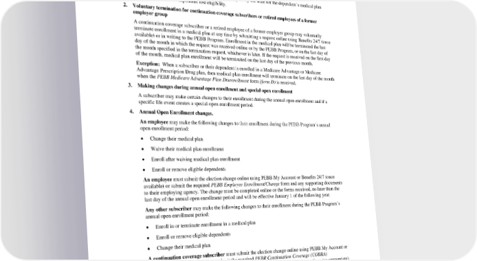 • The subscriber may be billed for claims paid by the medical plan for services that were rendered after the dependent lost eligibility. • The subscriber may not be able to recover subscriber-paid insurance premiums for the dependent that lost eligibility. • The subscriber may be responsible for premiums paid by the state for the dependent’s medical plan coverage after the dependent lost eligibility. 2. Voluntary termination for continuation coverage subscribers or retired employees of a former employer group A continuation coverage subscriber or a retired employee of a former employer group may voluntarily terminate enrollment in a medical plan at any time by submitting a request online using Benefits 24/7 (once available) or in writing to the PEBB Program. Enrollment in the medical plan will be terminated the last day of the month in which the request was received online or by the PEBB Program, or on the last day of the month specified in the termination request, whichever is later. If the request is received on the first day of the month, medical plan enrollment will be terminated on the last day of the previous month. Exception: When a subscriber or their dependent is enrolled in a Medicare Advantage or Medicare Advantage Prescription Drug plan, then medical plan enrollment will terminate on the last day of the month when the PEBB Medicare Advantage Plan Disenrollment form (form D) is received. 3. Making changes during annual open enrollment and special open enrollment A subscriber may make certain changes to their enrollment during the annual open enrollment and if a specific life event creates a special open enrollment period. 4. Annual Open Enrollment changes. An employee may make the following changes to their enrollment during the PEBB Program’s annual open enrollment period: • Change their medical plan • Waive their medical plan enrollment • Enroll after waiving medical plan enrollment • Enroll or remove eligible dependents An employee must submit the election change online using PEBB My Account or Benefits 24/7 (once available) or submit the required PEBB Employee Enrollment/Change form and any supporting documents to their employing agency. The change must be completed online or the forms received, no later than the last day of the annual open enrollment period and will be effective January 1 of the following year. Any other subscriber may make the following changes to their enrollment during the PEBB Program’s annual open enrollment period: • Enroll in or terminate enrollment in a medical plan • Enroll or remove eligible dependents • Change their medical plan A continuation coverage subscriber must submit the election change online using PEBB My Account or Benefits 24/7 (once available) or submit the required PEBB Continuation Coverage (COBRA) Election/Change, or PEBB Continuation Coverage (Unpaid Leave) Election/Change form (as appropriate) and any supporting documents to the PEBB Program. The change must be completed online, or the forms received, no later than the last day of the annual open enrollment period and will be effective January 1 of the following year. A retired employee of a former employer group must submit the election change online using PEBB My Account or Benefits 24/7 (once available) or submit the required PEBB Continuation Coverage (Employer PEBB HMOHSA 2024 54