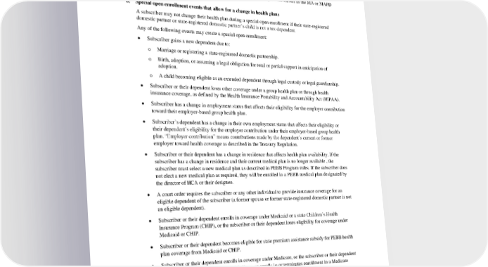 • Has seven months to enroll in an MA or MAPD plan that begins three months before they or their dependent first enrolled in both Medicare Part A and Part B and ends three months after the month of Medicare eligibility. They may also enroll themselves or their dependent in an MA or MAPD plan before their last day of the Medicare Part B initial enrollment period. The change must be made online using Benefits 24/7 (once available), or the forms must be received by the PEBB Program, no later than the last day of the month prior to the month they or their dependent enrolls in the MA or MAPD plan. 6. Special open enrollment events that allow for a change in health plans A subscriber may not change their health plan during a special open enrollment if their state-registered domestic partner or state-registered domestic partner’s child is not a tax dependent. Any of the following events may create a special open enrollment: • Subscriber gains a new dependent due to: o Marriage or registering a state-registered domestic partnership. o Birth, adoption, or assuming a legal obligation for total or partial support in anticipation of adoption. o A child becoming eligible as an extended dependent through legal custody or legal guardianship. • Subscriber or their dependent loses other coverage under a group health plan or through health insurance coverage, as defined by the Health Insurance Portability and Accountability Act (HIPAA). • Subscriber has a change in employment status that affects their eligibility for the employer contribution toward their employer-based group health plan. • Subscriber’s dependent has a change in their own employment status that affects their eligibility or their dependent’s eligibility for the employer contribution under their employer-based group health plan. “Employer contribution” means contributions made by the dependent’s current or former employer toward health coverage as described in the Treasury Regulation. • Subscriber or their dependent has a change in residence that affects health plan availability. If the subscriber has a change in residence and their current medical plan is no longer available , the subscriber must select a new medical plan as described in PEBB Program rules. If the subscriber does not elect a new medical plan as required, they will be enrolled in a PEBB medical plan designated by the director of HCA or their designee. • A court order requires the subscriber or any other individual to provide insurance coverage for an eligible dependent of the subscriber (a former spouse or former state-registered domestic partner is not an eligible dependent). • Subscriber or their dependent enrolls in coverage under Medicaid or a state Children’s Health Insurance Program (CHIP), or the subscriber or their dependent loses eligibility for coverage under Medicaid or CHIP. • Subscriber or their dependent becomes eligible for state premium assistance subsidy for PEBB health plan coverage from Medicaid or CHIP. • Subscriber or their dependent enrolls in coverage under Medicare, or the subscriber or their dependent loses eligibility for coverage under Medicare or enrolls in or terminates enrollment in a Medicare Advantage-Prescription Drug or a Part D plan. If the subscriber’s current medical plan becomes unavailable due to the subscriber or their dependents enrollment in Medicare, the subscriber must select a new medical plan. • Subscriber or their dependent’s current medical plan becomes unavailable because the subscriber or enrolled dependent is no longer eligible for a health savings account (HSA). PEBB HMOHSA 2024 56