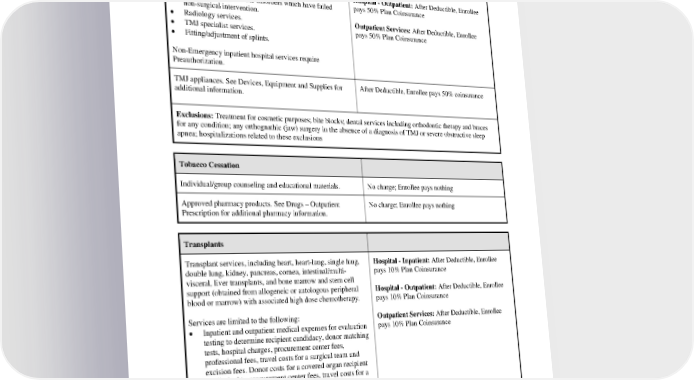 Temporomandibular Joint (TMJ) Medical and surgical services and related hospital charges for Hospital - Inpatient: After Deductible, Enrollee the treatment of temporomandibular joint (TMJ) disorders pays 50% Plan Coinsurance including: • Medically Necessary orthognathic procedures for the Hospital - Outpatient: After Deductible, Enrollee treatment of severe TMJ disorders which have failed pays 50% Plan Coinsurance non-surgical intervention. • Radiology services. Outpatient Services: After Deductible, Enrollee • TMJ specialist services. pays 50% Plan Coinsurance • Fitting/adjustment of splints. Non-Emergency inpatient hospital services require Preauthorization. TMJ appliances. See Devices, Equipment and Supplies for After Deductible, Enrollee pays 50% coinsurance additional information. Exclusions: Treatment for cosmetic purposes; bite blocks; dental services including orthodontic therapy and braces for any condition; any orthognathic (jaw) surgery in the absence of a diagnosis of TMJ or severe obstructive sleep apnea; hospitalizations related to these exclusions Tobacco Cessation Individual/group counseling and educational materials. No charge; Enrollee pays nothing Approved pharmacy products. See Drugs – Outpatient No charge; Enrollee pays nothing Prescription for additional pharmacy information. Transplants Transplant services, including heart, heart-lung, single lung, Hospital - Inpatient: After Deductible, Enrollee double lung, kidney, pancreas, cornea, intestinal/multi- pays 10% Plan Coinsurance visceral, liver transplants, and bone marrow and stem cell support (obtained from allogeneic or autologous peripheral Hospital - Outpatient: After Deductible, Enrollee blood or marrow) with associated high dose chemotherapy. pays 10% Plan Coinsurance Services are limited to the following: Outpatient Services: After Deductible, Enrollee • Inpatient and outpatient medical expenses for evaluation pays 10% Plan Coinsurance testing to determine recipient candidacy, donor matching tests, hospital charges, procurement center fees, professional fees, travel costs for a surgical team and excision fees. Donor costs for a covered organ recipient are limited to procurement center fees, travel costs for a surgical team and excision fees. • Follow-up services for specialty visits • Rehospitalization • Maintenance medications during an inpatient stay Organ Transplant Recipient: All services and supplies related to the organ transplant, including transportation to and PEBB HMOHSA 2024 44