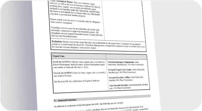 from KFHPWA Facilities (beyond the distance the Enrollee would normally be required to travel for most hospital services), are covered in accordance with the transplant benefit language, provided the Enrollee is accepted into the treating facility’s transplant program and continues to follow that program’s prescribed protocol. Organ Transplant Donor: The costs related to organ removal, as well as the cost of treating complications directly resulting from surgery, are covered, provided the organ recipient is an Enrollee under this Agreement, and provided the donor is not eligible for coverage under any other health care plan or government-funded program. Donor search costs for up to 15 searches only for allogeneic bone marrow transplants. Transplant services must be provided through locally and nationally contracted or approved transplant centers. All transplant services require Preauthorization. Contact Member Services for Preauthorization. Exclusions: Donor costs to the extent that they are reimbursable by the organ donor’s insurance; living expenses except as covered under Section II.K. Utilization Management; transportation expenses except as covered above; costs for searches for non-allogeneic bone marrow donors Urgent Care Inside the KFHPWA Service Area, urgent care is covered at a Network Emergency Department: After Kaiser Permanente medical center, Kaiser Permanente urgent Deductible, Enrollee pays 10% Plan Coinsurance care center or Network Provider’s office. Network Urgent Care Center: After Deductible, Outside the KFHPWA Service Area, urgent care is covered at Enrollee pays 10% Plan Coinsurance any medical facility. Network Provider’s Office: After Deductible, See Section XII. for a definition of Urgent Condition. Enrollee 10% Plan Coinsurance Non-Network Provider: After Deductible, Enrollee pays 10% Plan Coinsurance V. General Exclusions In addition to exclusions listed throughout the EOC, the following are not covered: 1. Benefits and related services, supplies and drugs that are not Medically Necessary for the treatment of an illness, injury, or physical disability, that are not specifically listed as covered in the EOC, except as required by federal or state law. 2. Services Related to Non-Covered Services: When a service is not covered, all services related to the non- covered service (except for the specific exceptions described below) are also excluded from coverage. Enrollees who have received a non-covered service, such as bariatric surgery, and develop an acute medical complication (such as band slippage, leak or infection) as a result, shall have coverage for Medically Necessary intervention PEBB HMOHSA 2024 45