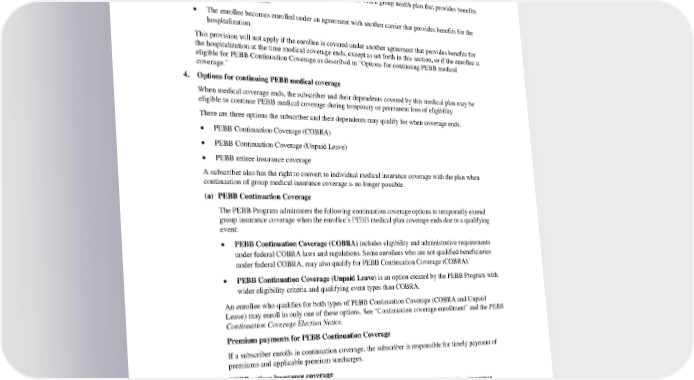 • According to this plan’s clinical criteria, it is no longer medically necessary for the enrollee to be an inpatient at the facility. • The remaining benefits available for the hospitalization are exhausted, regardless of whether a new calendar year begins. • The enrollee becomes covered under another agreement with a group health plan that provides benefits for the hospitalization. • The enrollee becomes enrolled under an agreement with another carrier that provides benefits for the hospitalization. This provision will not apply if the enrollee is covered under another agreement that provides benefits for the hospitalization at the time medical coverage ends, except as set forth in this section, or if the enrollee is eligible for PEBB Continuation Coverage as described in “Options for continuing PEBB medical coverage.” 4. Options for continuing PEBB medical coverage When medical coverage ends, the subscriber and their dependents covered by this medical plan may be eligible to continue PEBB medical coverage during temporary or permanent loss of eligibility. There are three options the subscriber and their dependents may qualify for when coverage ends. • PEBB Continuation Coverage (COBRA) • PEBB Continuation Coverage (Unpaid Leave) • PEBB retiree insurance coverage A subscriber also has the right to convert to individual medical insurance coverage with the plan when continuation of group medical insurance coverage is no longer possible. (a) PEBB Continuation Coverage The PEBB Program administers the following continuation coverage options to temporarily extend group insurance coverage when the enrollee’s PEBB medical plan coverage ends due to a qualifying event: • PEBB Continuation Coverage (COBRA) includes eligibility and administrative requirements under federal COBRA laws and regulations. Some enrollees who are not qualified beneficiaries under federal COBRA, may also qualify for PEBB Continuation Coverage (COBRA). • PEBB Continuation Coverage (Unpaid Leave) is an option created by the PEBB Program with wider eligibility criteria and qualifying event types than COBRA. An enrollee who qualifies for both types of PEBB Continuation Coverage (COBRA and Unpaid Leave) may enroll in only one of these options. See “Continuation coverage enrollment” and the PEBB Continuation Coverage Election Notice. Premium payments for PEBB Continuation Coverage If a subscriber enrolls in continuation coverage, the subscriber is responsible for timely payment of premiums and applicable premium surcharges. (b) PEBB retiree insurance coverage The following are eligible to continue enrollment or defer enrollment in PEBB retiree insurance coverage if they meet procedural and substantive eligibility requirements: • Retiring employee • Retiring school employee PEBB HMOHSA 2024 60