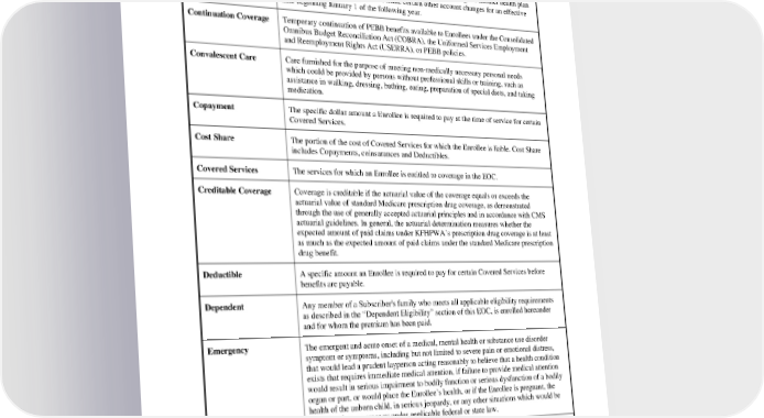 network facility. For more information about balance billing protections, please visit: https://healthy.kaiserpermanente.org/washington/support/forms and click on the “Billing forms” link. Annual Open A period of time defined by HCA when a Subscriber may change to another health plan Enrollment offered by the PEBB Program and make certain other account changes for an effective date beginning January 1 of the following year. Continuation Coverage Temporary continuation of PEBB benefits available to Enrollees under the Consolidated Omnibus Budget Reconciliation Act (COBRA), the Uniformed Services Employment and Reemployment Rights Act (USERRA), or PEBB policies. Convalescent Care Care furnished for the purpose of meeting non-medically necessary personal needs which could be provided by persons without professional skills or training, such as assistance in walking, dressing, bathing, eating, preparation of special diets, and taking medication. Copayment The specific dollar amount a Enrollee is required to pay at the time of service for certain Covered Services. Cost Share The portion of the cost of Covered Services for which the Enrollee is liable. Cost Share includes Copayments, coinsurances and Deductibles. Covered Services The services for which an Enrollee is entitled to coverage in the EOC. Creditable Coverage Coverage is creditable if the actuarial value of the coverage equals or exceeds the actuarial value of standard Medicare prescription drug coverage, as demonstrated through the use of generally accepted actuarial principles and in accordance with CMS actuarial guidelines. In general, the actuarial determination measures whether the expected amount of paid claims under KFHPWA’s prescription drug coverage is at least as much as the expected amount of paid claims under the standard Medicare prescription drug benefit. Deductible A specific amount an Enrollee is required to pay for certain Covered Services before benefits are payable. Dependent Any member of a Subscriber's family who meets all applicable eligibility requirements as described in the “Dependent Eligibility” section of this EOC, is enrolled hereunder and for whom the premium has been paid. Emergency The emergent and acute onset of a medical, mental health or substance use disorder symptom or symptoms, including but not limited to severe pain or emotional distress, that would lead a prudent layperson acting reasonably to believe that a health condition exists that requires immediate medical attention, if failure to provide medical attention would result in serious impairment to bodily function or serious dysfunction of a bodily organ or part, or would place the Enrollee’s health, or if the Enrollee is pregnant, the health of the unborn child, in serious jeopardy, or any other situations which would be considered an emergency under applicable federal or state law. A division, department, or separate agency of state government, including an institution Employing Agency of higher education; a county, municipality, or other political subdivision; and a tribal government covered by HCA statute. Enrollee Any enrolled Subscriber or Dependent. PEBB HMOHSA 2024 71