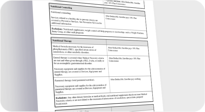 When an Enrollee gives birth, the newborn is entitled to the benefits set forth in the EOC from birth through 3 weeks of Hospital - Outpatient: After Deductible, Enrollee age. After 3 weeks of age, no benefits are available unless the pays 10% Plan Coinsurance newborn child qualifies as a Dependent and is enrolled. See Section VI. for enrollment information. Outpatient Services: After Deductible, Enrollee pays 10% Plan Coinsurance Nutritional Counseling Nutritional counseling. After Deductible, Enrollee pays 10% Plan Coinsurance Services related to a healthy diet to prevent obesity are covered as Preventive Services. See Preventive Services for additional information. Exclusions: Nutritional supplements; weight control self-help programs or memberships, such as Weight Watchers, Jenny Craig, or other such programs Nutritional Therapy Medical formula necessary for the treatment of After Deductible, Enrollee pays 10% Plan phenylketonuria (PKU), specified inborn errors of Coinsurance metabolism, or other metabolic disorders. Enteral therapy is covered when Medical Necessity criteria After Deductible, Enrollee pays 10% Plan are met and when given through a PEG, J tube, or orally or Coinsurance for an eosinophilic gastrointestinal disorder. Necessary equipment and supplies for the administration of enteral therapy are covered as Devices, Equipment and Supplies. Parenteral therapy (total parenteral nutrition). After Deductible, Enrollee pays nothing Necessary equipment and supplies for the administration of parenteral therapy are covered as Devices, Equipment and Supplies. Exclusions: Any other dietary formulas or medical foods; oral nutritional supplements that do not meet Medical Necessity criteria or are not related to the treatment of inborn errors of metabolism; special diets; prepared foods/meals Obesity Related Surgical Services Bariatric surgery is covered when KFHPWA criteria are met. Hospital - Inpatient: After Deductible, Enrollee pays 10% Plan Coinsurance Bariatric surgery related services require Preauthorization. Hospital - Outpatient: After Deductible, Enrollee Services related to obesity screening and counseling are pays 10% Plan Coinsurance covered as Preventive Services. PEBB HMOHSA 2024 32
