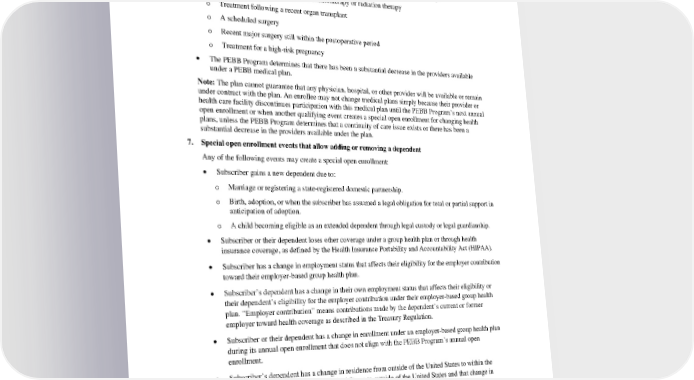 • Subscriber or their dependent experiences a disruption of care for active and ongoing treatment that could function as a reduction in benefits for the subscriber or their dependent. The subscriber may not change their health plan election because the subscriber or dependent’s physician stops participation with the subscriber’s health plan unless the PEBB Program determines that a continuity of care issue exists. The PEBB Program will consider but not limit its consideration to the following: o Active cancer treatment, such as chemotherapy or radiation therapy o Treatment following a recent organ transplant o A scheduled surgery o Recent major surgery still within the postoperative period o Treatment for a high-risk pregnancy • The PEBB Program determines that there has been a substantial decrease in the providers available under a PEBB medical plan. Note: The plan cannot guarantee that any physician, hospital, or other provider will be available or remain under contract with the plan. An enrollee may not change medical plans simply because their provider or health care facility discontinues participation with this medical plan until the PEBB Program’s next annual open enrollment or when another qualifying event creates a special open enrollment for changing health plans, unless the PEBB Program determines that a continuity of care issue exists or there has been a substantial decrease in the providers available under the plan. 7. Special open enrollment events that allow adding or removing a dependent Any of the following events may create a special open enrollment: • Subscriber gains a new dependent due to: o Marriage or registering a state-registered domestic partnership. o Birth, adoption, or when the subscriber has assumed a legal obligation for total or partial support in anticipation of adoption. o A child becoming eligible as an extended dependent through legal custody or legal guardianship. • Subscriber or their dependent loses other coverage under a group health plan or through health insurance coverage, as defined by the Health Insurance Portability and Accountability Act (HIPAA). • Subscriber has a change in employment status that affects their eligibility for the employer contribution toward their employer-based group health plan. • Subscriber’s dependent has a change in their own employment status that affects their eligibility or their dependent’s eligibility for the employer contribution under their employer-based group health plan. “Employer contribution” means contributions made by the dependent’s current or former employer toward health coverage as described in the Treasury Regulation. • Subscriber or their dependent has a change in enrollment under an employer-based group health plan during its annual open enrollment that does not align with the PEBB Program’s annual open enrollment. • Subscriber’s dependent has a change in residence from outside of the United States to within the United States, or from within the United States to outside of the United States and that change in residence resulted in the dependent losing their health insurance. • A court order requires the subscriber or any other individual to provide insurance coverage for an eligible dependent of the subscriber (a former spouse or former state-registered domestic partner is not an eligible dependent). PEBB HMOHSA 2024 57