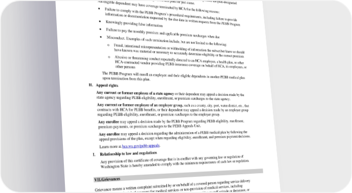 If coverage is no longer available to the employee under this certificate of coverage, then the employee may be eligible to purchase an individual medical plan from this plan consistent with premium rates filed with the Washington State Office of the Insurance Commissioner. 2. Termination for just cause The purpose of this provision is to allow for a fair and consistent method to process the plan-designated provider’s request to terminate coverage from this plan for just cause. An eligible dependent may have coverage terminated by HCA for the following reasons: • Failure to comply with the PEBB Program’s procedural requirements, including failure to provide information or documentation requested by the due date in written requests from the PEBB Program • Knowingly providing false information • Failure to pay the monthly premium and applicable premium surcharges when due • Misconduct. Examples of such termination include, but are not limited to the following: o Fraud, intentional misrepresentation or withholding of information the subscriber knew or should have known was material or necessary to accurately determine eligibility or the correct premium o Abusive or threatening conduct repeatedly directed to an HCA employee, a health plan, or other HCA-contracted vendor providing PEBB insurance coverage on behalf of HCA, its employees, or other persons The PEBB Program will enroll an employee and their eligible dependents in another PEBB medical plan upon termination from this plan. H. Appeal rights Any current or former employee of a state agency or their dependent may appeal a decision made by the state agency regarding PEBB eligibility, enrollment, or premium surcharges to the state agency. Any current or former employee of an employer group, such as a county, city, port, water district, etc., that contracts with HCA for PEBB benefits, or their dependent may appeal a decision made by an employer group regarding PEBB eligibility, enrollment, or premium surcharges to the employer group. Any enrollee may appeal a decision made by the PEBB Program regarding PEBB eligibility, enrollment, premium payments, or premium surcharges to the PEBB Appeals Unit. Any enrollee may appeal a decision regarding the administration of a PEBB medical plan by following the appeal provisions of the plan, except when regarding eligibility, enrollment, and premium payment decisions. Learn more at hca.wa.gov/pebb-appeals. I. Relationship to law and regulations Any provision of this certificate of coverage that is in conflict with any governing law or regulation of Washington State is hereby amended to comply with the minimum requirements of such law or regulation. VII. Grievances Grievance means a written complaint submitted by or on behalf of a covered person regarding service delivery issues other than denial of payment for medical services or non-provision of medical services, including dissatisfaction with medical care, waiting time for medical services, provider or staff attitude or demeanor, or dissatisfaction with service provided by the health carrier. The grievance process is outlined as follows: Step 1: It is recommended that the Enrollee should contact the person involved or the manager of the medical center/department where they are having a problem, explain their concerns and what they would like to have done to resolve the problem. The Enrollee should be specific and make his/her position clear. Most concerns can be resolved in this way. PEBB HMOHSA 2024 62
