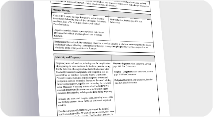 Therapy or Rehabilitation and Habilitative Care (occupational, physical and speech therapy, pulmonary and cardiac rehabilitation) and Neurodevelopmental Therapy section. Exclusions: Supportive care rendered primarily to maintain the level of correction already achieved; care rendered primarily for the convenience of the Enrollee; care rendered on a non-acute, asymptomatic basis; charges for any other services that do not meet KFHPWA clinical criteria as Medically Necessary Massage Therapy Visits with licensed massage therapists to restore function After Deductible, Enrollee pays 10% Plan immediately following illness, injury or surgery, limited to a Coinsurance combined total of 24 visits per calendar year without Preauthorization. Outpatient services require a prescription or order from a physician that reflects a written plan of care to restore function. Exclusions: Recreational; life-enhancing, relaxation or services designed to relieve or soothe symptoms of a disease or disorder without effecting a cure (palliative therapy); massage therapists preventive services; any services not within the scope of the practitioner’s licensure Maternity and Pregnancy Pregnancy care and services, including care for complications Hospital - Inpatient: After Deductible, Enrollee of pregnancy, in utero treatment for the fetus, prenatal testing pays 10% Plan Coinsurance for the detection of congenital and heritable disorders when Medically Necessary and prenatal and postpartum care are Hospital - Outpatient: After Deductible, Enrollee covered for all Enrollees including eligible Dependents. pays 10% Plan Coinsurance Preventive services related to preconception, prenatal and postpartum care are covered as Preventive Services including Outpatient Services: After Deductible, Enrollee breastfeeding support, supplies and counseling for each birth pays 10% Plan Coinsurance when Medically Necessary as determined by KFHPWA’s medical director and in accordance with Board of Health standards for screening and diagnostic tests during pregnancy. Delivery and associated Hospital Care, including home births and birthing centers. Home births are considered outpatient services. Enrollees must notify KFHPWA by way of the Hospital notification line within 24 hours of any admission, or as soon thereafter as medically possible. The Enrollee’s provider, in consultation with the Enrollee, will determine the Enrollee’s length of inpatient stay following delivery. Donor human milk will be covered during the inpatient hospital stay when Medically Necessary, provided through a milk bank and ordered by a licensed Provider or board- certified lactation consultant. PEBB HMOHSA 2024 29