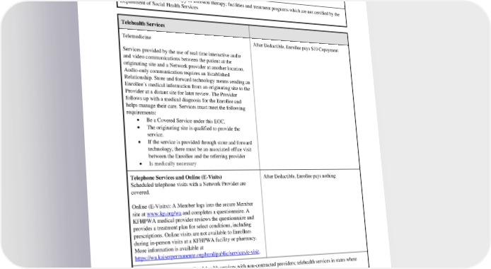 Enrollee to a Network Facility/program upon consultation between a Network Provider and the attending physician. If the Enrollee refuses transfer to a Network Facility/program, all further costs incurred during the hospitalization are the responsibility of the Enrollee. Exclusions: Wilderness therapy or aversion therapy; facilities and treatment programs which are not certified by the Department of Social Health Services Telehealth Services Telemedicine After Deductible, Enrollee pays $10 Copayment Services provided by the use of real time interactive audio and video communications between the patient at the originating site and a Network provider at another location. Audio-only communication requires an Established Relationship. Store and forward technology means sending an Enrollee’s medical information from an originating site to the Provider at a distant site for later review. The Provider follows up with a medical diagnosis for the Enrollee and helps manage their care. Services must meet the following requirements: • Be a Covered Service under this EOC. • The originating site is qualified to provide the service. • If the service is provided through store and forward technology, there must be an associated office visit between the Enrollee and the referring provider • Is medically necessary Telephone Services and Online (E-Visits) After Deductible, Enrollee pays nothing Scheduled telephone visits with a Network Provider are covered. Online (E-Visits): A Member logs into the secure Member site at www.kp.org/wa and completes a questionnaire. A KFHPWA medical provider reviews the questionnaire and provides a treatment plan for select conditions, including prescriptions. Online visits are not available to Enrollees during in-person visits at a KFHPWA facility or pharmacy. More information is available at https://wa.kaiserpermanente.org/html/public/services/e-visit. Exclusions: Fax and e-mail; telehealth services with non-contracted providers; telehealth services in states where prohibited by law; all other services not listed above PEBB HMOHSA 2024 43