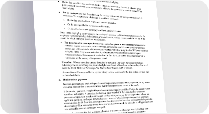 • Employee becomes eligible and enrolls in Medicare or loses eligibility for Medicare. F. When medical coverage ends 1. Termination dates Medical coverage ends on the following dates: • On the last day of the month when any enrollee ceases to be eligible. • On the date a medical plan terminates due to a change in contracted service area or when the group policy ends. If that should occur, the subscriber will have the opportunity to enroll in another PEBB medical plan. • For an employee and their dependents, on the last day of the month the employment relationship is terminated. The employment relationship is considered terminated: o On the date specified in an employee’s letter of resignation. o On the date specified in any contract or hire letter. o On the effective date of an employer-initiated termination notice. Note: If the employing agency deducted the employee’s premium for PEBB insurance coverage after the employee was no longer eligible for the employer contribution, medical coverage ends the last day of the month for which employee premiums were deducted. • For a continuation coverage subscriber or a retired employee of a former employer group who submits a request to terminate medical coverage, enrollment in medical coverage will be terminated the last day of the month in which the request was received online using Benefits 24/7 (once available) or by the PEBB Program, or on the last day of the month specified in the termination request, whichever is later. If the request is received on the first day of the month, medical coverage will be terminated on the last day of the previous month. Exception: When a subscriber or their dependent is enrolled in a Medicare Advantage or Medicare Advantage Prescription Drug plan, the medical plan enrollment will terminate on the last day of the month when the PEBB Medicare Advantage Plan Disenrollment form (form D) is received. A subscriber will be responsible for payment of any services received after the date medical coverage ends as described above. 2. Final premium payments Premium payments and applicable premium surcharges are not prorated during any month, for any reason, even if an enrollee dies or asks to terminate their medical plan before the end of the month. If the monthly premium or applicable premium surcharges remain unpaid for 30 days, the account will be considered delinquent. A subscriber is allowed a grace period of 30 days from the date the monthly premiums or applicable premium surcharges become delinquent to pay the unpaid premium balance and applicable premium surcharges. If the subscriber’s premium balance or applicable premium surcharges remain unpaid for 60 days from the original due date, the subscriber’s medical coverage (including enrolled dependents) will be terminated retroactive to the last day of the month for which the monthly premiums and any applicable premium surcharges were paid. For a subscriber enrolled in a Medicare Advantage or a Medicare Advantage-Prescription Drug plan, a notice will be sent notifying them that they are delinquent on their monthly premium and that the enrollment will be terminated prospectively to the end of the month after the notice is sent. 3. If an enrollee is hospitalized An enrollee who is receiving covered services in a hospital on the date medical coverage ends will continue to be eligible for covered services while an inpatient for the condition which the enrollee was hospitalized, until one of the following events occur: PEBB HMOHSA 2024 59