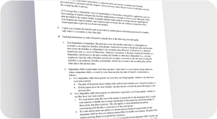 Order of Benefit Determination Rules. When an Enrollee is covered by two or more plans, the rules for determining the order of benefit payments are as follows: A. The primary plan pays or provides its benefits according to its terms of coverage and without regard to the benefits under any other plan. B. (1) Except as provided below (subsection 2), a plan that does not contain a coordination of benefits provision that is consistent with this chapter is always primary unless the provisions of both plans state that the complying plan is primary. (2) Coverage that is obtained by virtue of membership in a Group that is designed to supplement a part of a basic package of benefits and provides that this supplementary coverage is excess to any other parts of the plan provided by the contract holder. Examples include major medical coverages that are superimposed over hospital and surgical benefits, and insurance type coverages that are written in connection with a closed panel plan to provide out-of-network benefits. C. A plan may consider the benefits paid or provided by another plan in calculating payment of its benefits only when it is secondary to that other plan. D. Each plan determines its order of benefits using the first of the following rules that apply: 1. Non-Dependent or Dependent. The plan that covers the Enrollee other than as a Dependent, for example as an employee, Enrollee, policyholder, Subscriber or retiree is the primary plan and the plan that covers the Enrollee as a Dependent is the secondary plan. However, if the person is a Medicare beneficiary and, as a result of federal law, Medicare is secondary to the plan covering the Enrollee as a Dependent, and primary to the plan covering the Enrollee as other than a Dependent (e.g., a retired employee), then the order of benefits between the two plans is reversed so that the plan covering the Enrollee as an employee, Enrollee, policyholder, Subscriber or retiree is the secondary plan and the other plan is the primary plan. 2. Dependent child covered under more than one plan. Unless there is a court decree stating otherwise, when a dependent child is covered by more than one plan the order of benefits is determined as follows: a) For a dependent child whose parents are married or are living together, whether or not they have ever been married: • The plan of the parent whose birthday falls earlier in the calendar year is the primary plan; or • If both parents have the same birthday, the plan that has covered the parent the longest is the primary plan. b) For a dependent child whose parents are divorced or separated or not living together, whether or not they have ever been married: i. If a court decree states that one of the parents is responsible for the dependent child’s health care expenses or health care coverage and the plan of that parent has actual knowledge of those terms, that plan is primary. This rule applies to claim determination periods commencing after the plan is given notice of the court decree; ii. If a court decree states one parent is to assume primary financial responsibility for the dependent child but does not mention responsibility for health care expenses, the plan of the parent assuming financial responsibility is primary; iii. If a court decree states that both parents are responsible for the dependent child’s health care expenses or health care coverage, the provisions of a) above determine the order of benefits; iv. If a court decree states that the parents have joint custody without specifying that one parent has responsibility for the health care expenses or health care coverage of the dependent child, the provisions of Subsection a) above determine the order of benefits; or v. If there is no court decree allocating responsibility for the dependent child’s health care expenses or health care coverage, the order of benefits for the child are as follows: • The plan covering the custodial parent, first; PEBB HMOHSA 2024 67