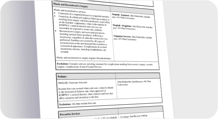 for additional information related to chronic disease management. See Hospital - Inpatient and Outpatient for outpatient hospital medical and surgical services, including ambulatory surgical centers. Plastic and Reconstructive Surgery Plastic and reconstructive services: Hospital - Inpatient: After Deductible, Enrollee • Correction of a congenital disease or congenital anomaly. pays 10% Plan Coinsurance • Correction of a Medical Condition following an injury or resulting from surgery which has produced a major effect on the Enrollee’s appearance, when in the opinion of Hospital - Outpatient: After Deductible, Enrollee KFHPWA’s medical director such services can pays 10% Plan Coinsurance reasonably be expected to correct the condition. • Reconstructive surgery and associated procedures, including internal breast prostheses, following a Outpatient Services: After Deductible, Enrollee mastectomy, regardless of when the mastectomy was pays 10% Plan Coinsurance performed. Enrollees are covered for all stages of reconstruction on the non-diseased breast produce a symmetrical appearance. Complications of covered mastectomy services, including lymphedemas, are covered. Plastic and reconstructive surgery requires Preauthorization. Exclusions: Cosmetic services including treatment for complications resulting from cosmetic surgery; cosmetic surgery; complications of non-Covered Services Podiatry Medically Necessary foot care. After Deductible, Enrollee pays 10% Plan Coinsurance Routine foot care covered when such care is directly related to the treatment of diabetes and, when approved by KFHPWA’s medical director, other clinical conditions that affect sensation and circulation to the feet. Exclusions: All other routine foot care Preventive Services Preventive services in accordance with the well care schedule No charge; Enrollee pays nothing established by KFHPWA may require Preauthorization. The well care schedule is available in Kaiser Permanente medical centers, at www.kp.org/wa, or upon request from Member Services. Screening and tests with A and B recommendations by the PEBB HMOHSA 2024 36