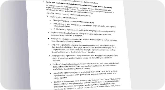 • Subscriber or their dependent enrolls in coverage under Medicaid or a state Children’s Health Insurance Program (CHIP), or the subscriber or their dependent loses eligibility for coverage under Medicaid or CHIP. • Subscriber or their dependent becomes eligible for a state premium assistance subsidy for PEBB health plan coverage from Medicaid or CHIP. • Subscriber’s dependent enrolls in Medicare or loses eligibility for Medicare. 8. Special open enrollment events that allow waiving medical enrollment and enrolling after waiving An employee may waive PEBB medical during a special open enrollment if they are enrolled in other employer-based group medical, a TRICARE plan, or Medicare. An employee may not waive enrollment in PEBB medical if they are enrolled in PEBB retiree insurance coverage. Any of the following events may create a special open enrollment: • Employee gains a new dependent due to: o Marriage or registering a state-registered domestic partnership. o Birth, adoption, or when the employee has assumed a legal obligation for total or partial support in anticipation of adoption. o A child becoming eligible as an extended dependent through legal custody or legal guardianship. • Employee or their dependent loses other coverage under a group health plan or through health insurance coverage, as defined by the HIPAA. • Employee has a change in employment status that affects their eligibility for the employer contribution toward their employer-based group medical. • Employee’s dependent has a change in their own employment status that affects their eligibility or their dependent’s eligibility for the employer contribution under their employer-based group medical. “Employer contribution” means contributions made by the dependent’s current or former employer toward health coverage as described in the Treasury Regulation. • Employee or their dependent has a change in enrollment under an employer-based group medical plan during its annual open enrollment that does not align with the PEBB Program’s annual open enrollment. • Employee’s dependent has a change in residence from outside of the United States to within the United States, or from within the United States to outside of the United States and the change in residence resulted in the dependent losing their health insurance. • A court order requires the employee or any other individual to provide a health plan for an eligible dependent of the employee (a former spouse or former state-registered domestic partner is not an eligible dependent). • Employee or their dependent enrolls in coverage under Medicaid or a state Children’s Health Insurance Program (CHIP), or the employee or their dependent loses eligibility for coverage under Medicaid or CHIP. Note: An employee may only return from having waived PEBB medical for the events described in this paragraph. An employee may not waive their PEBB medical for the events described in this paragraph. • Employee or their dependent becomes eligible for a state premium assistance subsidy for PEBB health plan coverage from Medicaid or CHIP. • Employee or their dependent becomes eligible and enrolls in a TRICARE plan, or loses eligibility for a TRICARE plan. PEBB HMOHSA 2024 58