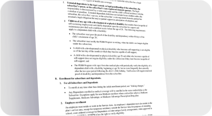 d. Children of the subscriber’s state-registered domestic partner, based on the state-registered domestic partner’s establishment of a parent-child relationship, except when parental rights have been terminated. The child’s relationship to the subscriber (and eligibility as a dependent) ends on the same date the subscriber’s legal relationship with the state-registered domestic partner ends through divorce, annulment, dissolution, termination, or death; e. Children specified in a court order or divorce decree for whom the subscriber has a legal obligation to provide support or health care coverage; f. Extended dependents in the legal custody or legal guardianship of the subscriber, the subscriber’s spouse, or the subscriber’s state-registered domestic partner. The legal responsibility is demonstrated by a valid court order and the child’s official residence with the custodian or guardian. Extended dependent child does not include foster children unless the subscriber, the subscriber’s spouse, or the subscriber’s state-registered domestic partner has assumed a legal obligation for total or partial support in anticipation of adoption; and g. Children of any age with a developmental or physical disability that renders them incapable of self-sustaining employment and chiefly dependent upon the subscriber for support and maintenance provided such condition occurs before the age of 26. The following requirements apply to a dependent child with a disability: The subscriber must provide proof of the disability and dependency within 60 days of the • child’s attainment of age 26; The subscriber must notify the PEBB Program in writing, when the child is no longer eligible • under this subsection; A child with a developmental or physical disability who becomes self-supporting is not eligible • as of the last day of the month in which they become capable of self-support; A child with a developmental or physical disability age 26 and older who becomes capable of • self-support does not regain eligibility under this subsection if they later become incapable of self-support; and The PEBB Program with input from the medical plan will periodically verify the eligibility of a • dependent child with a disability beginning at age 26, but no more frequently than annually after the two-year period following the child’s 26th birthday. Verification will require renewed proof of disability and dependence from the subscriber. B. Enrollment for subscribers and dependents. 1. For all Subscribers and Dependents • To enroll at any time other than during the initial enrollment period, see “Making changes.” • Any Dependents enrolled in medical coverage will be enrolled in the same medical plan as the Subscriber. Exceptions apply for non-Medicare enrollees when a subscriber selects a Medicare Supplement, Medicare Advantage, or Medicare Advantage Prescription Drug plan. 2. Employee enrollment An employee must reside or work in the Service Area. An employee’s dependent must also reside in the plan’s service area, except for temporary residency outside the Service Area for purposes of attending school, court-ordered coverage for Dependents or other unique family arrangements, when approved in advance by KFHPWA. KFHPWA has the right to verify eligibility. An employee must use Benefits 24/7, the online enrollment system (once available), or submit a PEBB Employee Enrollment/Change or PEBB Employee Enrollment/Change (for Medical Only Groups) form and any supporting documents to their employing agency when they become newly eligible or regain eligibility for PEBB benefits. The online enrollment must be completed or the form must be received no later than 31 days after the date the employee becomes eligible or regains eligibility. PEBB HMOHSA 2024 49