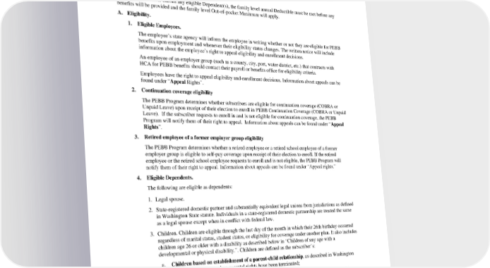VI. Eligibility, Enrollment and Termination In these sections, “health plan” is used to refer to a plan offering medical or dental, or both, developed by the Public Employees Benefits Board (PEBB) and provided by a contracted vendor or self-insured plans administered by the Health Care Authority (HCA). Note: If a Subscriber enrolls any eligible Dependent(s), the family level annual Deductible must be met before any benefits will be provided and the family level Out-of-pocket Maximum will apply. A. Eligibility. 1. Eligible Employees. The employee’s state agency will inform the employee in writing whether or not they are eligible for PEBB benefits upon employment and whenever their eligibility status changes. The written notice will include information about the employee’s right to appeal eligibility and enrollment decisions. An employee of an employer group (such as a county, city, port, water district, etc.) that contracts with HCA for PEBB benefits should contact their payroll or benefits office for eligibility criteria. Employees have the right to appeal eligibility and enrollment decisions. Information about appeals can be found under “Appeal Rights”. 2. Continuation coverage eligibility The PEBB Program determines whether subscribers are eligible for continuation coverage (COBRA or Unpaid Leave) upon receipt of their election to enroll in PEBB Continuation Coverage (COBRA or Unpaid Leave). If the subscriber requests to enroll in and is not eligible for continuation coverage, the PEBB Program will notify them of their right to appeal. Information about appeals can be found under “Appeal Rights”. 3. Retired employee of a former employer group eligibility The PEBB Program determines whether a retired employee or a retired school employee of a former employer group is eligible to self-pay coverage upon receipt of their election to enroll. If the retired employee or the retired school employee requests to enroll and is not eligible, the PEBB Program will notify them of their right to appeal. Information about appeals can be found under “Appeal rights.” 4. Eligible Dependents. The following are eligible as dependents: 1. Legal spouse. 2. State-registered domestic partner and substantially equivalent legal unions from jurisdictions as defined in Washington State statute. Individuals in a state-registered domestic partnership are treated the same as a legal spouse except when in conflict with federal law. 3. Children. Children are eligible through the last day of the month in which their 26th birthday occurred regardless of marital status, student status, or eligibility for coverage under another plan. It also includes children age 26 or older with a disability as described below in “Children of any age with a developmental or physical disability.”. Children are defined as the subscriber’s: a. Children based on establishment of a parent-child relationship, as described in Washington State statutes, except when parental rights have been terminated; b. Children of the subscriber’s spouse, based on the spouse’s establishment of a parent-child relationship, except when parental rights have been terminated. The stepchild’s relationship to the subscriber (and eligibility as a dependent) ends on the same date the marriage with the spouse ends through divorce, annulment, dissolution, termination, or death; c. Children for whom the subscriber has assumed a legal obligation for total or partial support in anticipation of adoption of the child; PEBB HMOHSA 2024 48