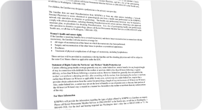 Important Notice Under Federal Health Care Reform Kaiser Foundation Health Plan of Washington (“KFHPWA”) recommends each Enrollee choose a Network Personal Physician. This decision is important since the designated Network Personal Physician provides or arranges for most of the Enrollee’s health care. The Enrollee has the right to designate any Network Personal Physician who participates in one of the KFHPWA networks and who is available to accept the Enrollee or the Enrollee’s family members. For information on how to select a Network Personal Physician, and for a list of the participating Network Personal Physicians, please call Kaiser Permanente Member Services at (206) 630-0107 in the Seattle area, or toll-free in Washington, 1-866-648-1928. For children, the Enrollee may designate a pediatrician as the primary care provider. The Enrollee does not need Preauthorization from KFHPWA or from any other person (including a Network Personal Physician) to access obstetrical or gynecological care from a health care professional in the KFHPWA network who specializes in obstetrics or gynecology. The health care professional, however, may be required to comply with certain procedures, including obtaining Preauthorization for certain services, following a pre-approved treatment plan, or procedures for obtaining Preauthorization. For a list of participating health care professionals who specialize in obstetrics or gynecology, please call Kaiser Permanente Member Services at (206) 630-0107 in the Seattle area, or toll-free in Washington, 1-866-648-1928. Women’s health and cancer rights If the Enrollee is receiving benefits for a covered mastectomy and elects breast reconstruction in connection with the mastectomy, the Enrollee will also receive coverage for: • All stages of reconstruction of the breast on which the mastectomy has been performed. • Surgery and reconstruction of the other breast to produce a symmetrical appearance. • Prostheses. • Treatment of physical complications of all stages of mastectomy, including lymphedemas. These services will be provided in consultation with the Enrollee and the attending physician and will be subject to the same Cost Shares otherwise applicable under the EOC. Statement of Rights Under the Newborns’ and Mothers’ Health Protection Act Carriers offering group health coverage generally may not, under federal law, restrict benefits for any hospital length of stay in connection with childbirth for the mother or newborn child to less than 48 hours following a vaginal delivery, or less than 96 hours following a cesarean section. However, federal law generally does not prohibit the mother’s or newborn’s attending provider, after consulting with the mother, from discharging the mother or newborn earlier than 48 hours (or 96 hours as applicable). In any case, carriers may not, under federal law, require that a provider obtain authorization from the carrier for prescribing a length of stay not in excess of 48 hours (or 96 hours). Also, under federal law, a carrier may not set the level of benefits or out-of-pocket costs so that any later portion of the 48-hour (or 96-hour) stay is treated in a manner less favorable to the mother or newborn than any earlier portion of the stay. For More Information KFHPWA will provide the information regarding the types of plans offered by KFHPWA to Enrollees on request. Please call Kaiser Permanente Member Services at (206) 630-0107 in the Seattle area, or toll-free in Washington, 1- 866-648-1928. For the deaf and hearing-impaired use Washington state’s relay line at 800-833-6388 or 711 for benefits questions. PEBB HMOHSA 2024 2