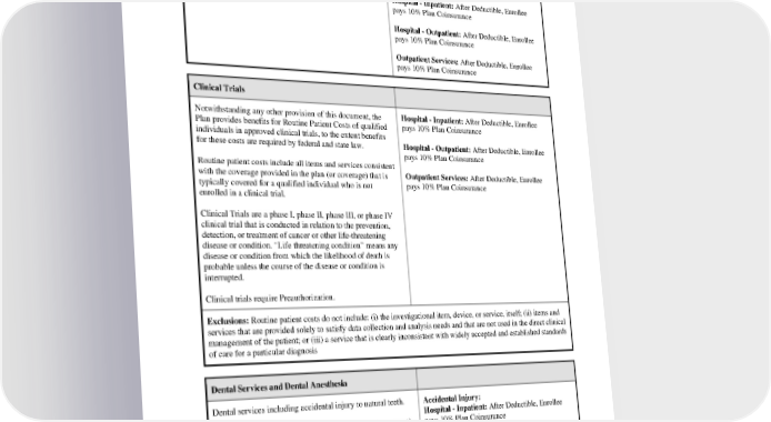 Circumcision Circumcision. (After Deductible, Enrollee pays nothing if provided within 60 days of birth) Non-Emergency inpatient hospital services require Preauthorization. Hospital - Inpatient: After Deductible, Enrollee pays 10% Plan Coinsurance Hospital - Outpatient: After Deductible, Enrollee pays 10% Plan Coinsurance Outpatient Services: After Deductible, Enrollee pays 10% Plan Coinsurance Clinical Trials Notwithstanding any other provision of this document, the Hospital - Inpatient: After Deductible, Enrollee Plan provides benefits for Routine Patient Costs of qualified pays 10% Plan Coinsurance individuals in approved clinical trials, to the extent benefits for these costs are required by federal and state law. Hospital - Outpatient: After Deductible, Enrollee pays 10% Plan Coinsurance Routine patient costs include all items and services consistent with the coverage provided in the plan (or coverage) that is Outpatient Services: After Deductible, Enrollee typically covered for a qualified individual who is not pays 10% Plan Coinsurance enrolled in a clinical trial. Clinical Trials are a phase I, phase II, phase III, or phase IV clinical trial that is conducted in relation to the prevention, detection, or treatment of cancer or other life-threatening disease or condition. “Life threatening condition” means any disease or condition from which the likelihood of death is probable unless the course of the disease or condition is interrupted. Clinical trials require Preauthorization. Exclusions: Routine patient costs do not include: (i) the investigational item, device, or service, itself; (ii) items and services that are provided solely to satisfy data collection and analysis needs and that are not used in the direct clinical management of the patient; or (iii) a service that is clearly inconsistent with widely accepted and established standards of care for a particular diagnosis Dental Services and Dental Anesthesia Dental services including accidental injury to natural teeth. Accidental Injury: Hospital - Inpatient: After Deductible, Enrollee Dental Services (i.e., examination, evaluation and treatment) pays 10% Plan Coinsurance necessitated by accidental injury to sound natural teeth. Hospital - Outpatient: After Deductible, Enrollee Evaluation and a written treatment plan must be completed pays 10% Plan Coinsurance within 30 days from the date of injury. Treatment must be completed within the treatment plan time frames. Outpatient Services: After Deductible, Enrollee pays 10% Plan Coinsurance PEBB HMOHSA 2024 16