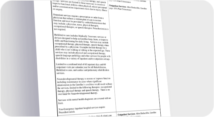 Rehabilitation and Habilitative Care (occupational, physical and speech therapy, pulmonary and cardiac rehabilitation) and Neurodevelopmental Therapy Rehabilitation services to restore function following illness, Hospital - Inpatient: After Deductible, Enrollee injury or surgery, limited to the following restorative pays 10% Plan Coinsurance therapies: occupational therapy, physical therapy, and speech therapy. Services are limited to those necessary to restore or Outpatient Services: After Deductible, Enrollee improve functional abilities when physical, sensori-perceptual pays 10% Plan Coinsurance and/or communication impairment exists due to injury, illness or surgery. Outpatient services require a prescription or order from a physician that reflects a written plan of care to restore function and must be provided by a rehabilitation team that may include a physician, nurse, physical therapist, occupational therapist, or speech therapist. Preauthorization is not required. Habilitative care includes Medically Necessary services or devices designed to help an Enrollee keep, learn, or improve skills and functioning for daily living. Services may include occupational therapy, physical therapy, speech therapy when prescribed by a physician. Examples include therapy for a child who is not walking or talking at the expected age. These services may include physical and occupational therapy, speech-language pathology and other services for people with disabilities in a variety of inpatient and/or outpatient settings. Limited to a combined total of 60 inpatient days and 60 outpatient visits per calendar year for all Rehabilitation, Habilitative care, and cardiac and pulmonary rehabilitation services. Neurodevelopmental therapy to restore or improve function including maintenance in cases where significant deterioration in the Enrolleeās condition would result without the services, limited to the following therapies: occupational therapy, physical therapy and speech therapy. There is no visit limit for Neurodevelopmental therapy. Services with mental health diagnoses are covered with no limit. Non-Emergency inpatient hospital services require Preauthorization. Cardiac rehabilitation is covered when clinical criteria are Outpatient Services: After Deductible, Enrollee met. pays 10% Plan Coinsurance Preauthorization is required after initial limit. Limited to a combined total of 60 inpatient days and 60 outpatient visits per calendar year for all Rehabilitation, Habilitative care, cardiac and pulmonary rehabilitation PEBB HMOHSA 2024 38