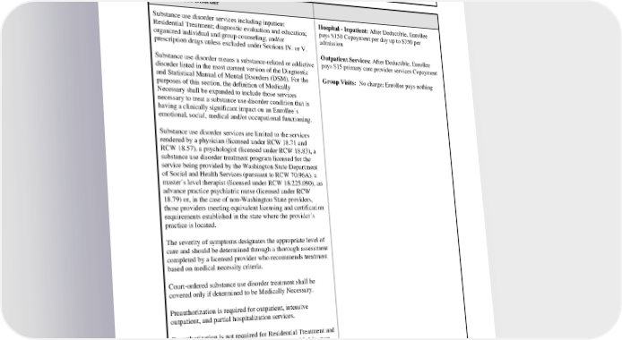 nothing Exclusions: Procedures and services to reverse a sterilization Substance Use Disorder Substance use disorder services including inpatient Hospital - Inpatient: After Deductible, Enrollee Residential Treatment; diagnostic evaluation and education; pays $150 Copayment per day up to $750 per organized individual and group counseling; and/or admission prescription drugs unless excluded under Sections IV. or V. Outpatient Services: After Deductible, Enrollee Substance use disorder means a substance-related or addictive pays $15 primary care provider services Copayment disorder listed in the most current version of the Diagnostic and Statistical Manual of Mental Disorders (DSM). For the Group Visits: No charge; Enrollee pays nothing purposes of this section, the definition of Medically Necessary shall be expanded to include those services necessary to treat a substance use disorder condition that is having a clinically significant impact on an Enrollee’s emotional, social, medical and/or occupational functioning. Substance use disorder services are limited to the services rendered by a physician (licensed under RCW 18.71 and RCW 18.57), a psychologist (licensed under RCW 18.83), a substance use disorder treatment program licensed for the service being provided by the Washington State Department of Social and Health Services (pursuant to RCW 70.96A), a master’s level therapist (licensed under RCW 18.225.090), an advance practice psychiatric nurse (licensed under RCW 18.79) or, in the case of non-Washington State providers, those providers meeting equivalent licensing and certification requirements established in the state where the provider’s practice is located. The severity of symptoms designates the appropriate level of care and should be determined through a thorough assessment completed by a licensed provider who recommends treatment based on medical necessity criteria. Court-ordered substance use disorder treatment shall be covered only if determined to be Medically Necessary. Preauthorization is required for outpatient, intensive outpatient, and partial hospitalization services. Preauthorization is not required for Residential Treatment and non-Emergency inpatient hospital services provided in-state. Enrollee is given two days of treatment and is then subject to medical necessity review for continued care. Enrollee or facility must notify KFHPWA within 24 hours of admission, or as soon as possible. Enrollee may request prior authorization for Residential Treatment and non-Emergency inpatient hospital services. Enrollee may contact Member PEBB_CA_2024 41