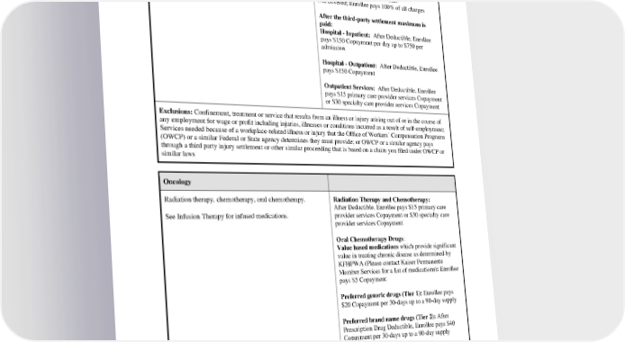 On the Job Injuries or Illnesses On the job injuries or illnesses. Office of Worker’s Compensation Programs (OWCP) or similar Federal or State agency pays through a third-party settlement: Not covered; Enrollee pays 100% of all charges After the third-party settlement maximum is paid: Hospital - Inpatient: After Deductible, Enrollee pays $150 Copayment per day up to $750 per admission Hospital - Outpatient: After Deductible, Enrollee pays $150 Copayment Outpatient Services: After Deductible, Enrollee pays $15 primary care provider services Copayment or $30 specialty care provider services Copayment Exclusions: Confinement, treatment or service that results from an illness or injury arising out of or in the course of any employment for wage or profit including injuries, illnesses or conditions incurred as a result of self-employment; Services needed because of a workplace-related illness or injury that the Office of Workers’ Compensation Programs (OWCP) or a similar Federal or State agency determines they must provide; or OWCP or a similar agency pays through a third party injury settlement or other similar proceeding that is based on a claim you filed under OWCP or similar laws Oncology Radiation therapy, chemotherapy, oral chemotherapy. Radiation Therapy and Chemotherapy: After Deductible, Enrollee pays $15 primary care See Infusion Therapy for infused medications. provider services Copayment or $30 specialty care provider services Copayment Oral Chemotherapy Drugs: Value based medications which provide significant value in treating chronic disease as determined by KFHPWA (Please contact Kaiser Permanente Member Services for a list of medications): Enrollee pays $5 Copayment Preferred generic drugs (Tier 1): Enrollee pays $20 Copayment per 30-days up to a 90-day supply Preferred brand name drugs (Tier 2): After Prescription Drug Deductible, Enrollee pays $40 Copayment per 30-days up to a 90-day supply Non-Preferred generic and brand name drugs (Tier 3): After Prescription Drug Deductible, Enrollee pays 50% up to $250 maximum per 30-days up to a 90-day supply PEBB_CA_2024 33