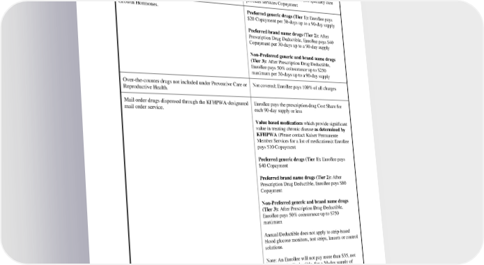available regarding the Kaiser Permanente coupon program rules and limitations at www.kp.org/rxcoupons. Injections administered by a Network Provider in a clinical After Deductible, Enrollee pays $15 primary care setting. provider services Copayment or $30 specialty care provider services Copayment Growth Hormones. Preferred generic drugs (Tier 1): Enrollee pays $20 Copayment per 30-days up to a 90-day supply Preferred brand name drugs (Tier 2): After Prescription Drug Deductible, Enrollee pays $40 Copayment per 30-days up to a 90-day supply Non-Preferred generic and brand name drugs (Tier 3): After Prescription Drug Deductible, Enrollee pays 50% coinsurance up to $250 maximum per 30-days up to a 90-day supply Over-the-counter drugs not included under Preventive Care or Not covered; Enrollee pays 100% of all charges Reproductive Health. Mail order drugs dispensed through the KFHPWA-designated Enrollee pays the prescription drug Cost Share for mail order service. each 90-day supply or less Value based medications which provide significant value in treating chronic disease as determined by KFHPWA (Please contact Kaiser Permanente Member Services for a list of medications): Enrollee pays $10 Copayment Preferred generic drugs (Tier 1): Enrollee pays $40 Copayment Preferred brand name drugs (Tier 2): After Prescription Drug Deductible, Enrollee pays $80 Copayment Non-Preferred generic and brand name drugs (Tier 3): After Prescription Drug Deductible, Enrollee pays 50% coinsurance up to $750 maximum Annual Deductible does not apply to strip-based blood glucose monitors, test strips, lancets or control solutions. Note: An Enrollee will not pay more than $35, not subject to the Deductible, for a 30-day supply of insulin to comply with state law requirements. Any cost-sharing paid will apply to the annual Deductible The KFHPWA Preferred drug list is a list of prescription drugs, supplies, and devices considered to have acceptable efficacy, safety and cost-effectiveness. The Preferred drug list is maintained by a committee consisting of a group of PEBB_CA_2024 21