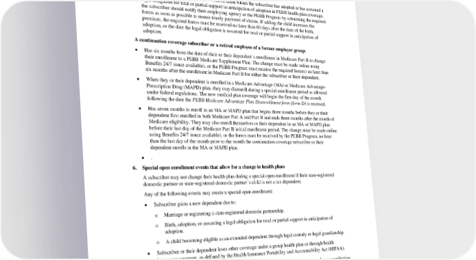 The change must be completed online, or the forms must be received, no later than 60 days after the event that creates the special open enrollment. In addition, the PEBB Program or the employing agency will require the subscriber to provide proof of a dependent’s eligibility, evidence of the event that created the special open enrollment, or both. Exceptions: • If a subscriber wants to enroll a newborn or child whom the subscriber has adopted or has assumed a legal obligation for total or partial support in anticipation of adoption in PEBB health plan coverage, the subscriber should notify their employing agency or the PEBB Program by submitting the required forms as soon as possible to ensure timely payment of claims. If adding the child increases the premium, the required forms must be received no later than 60 days after the date of the birth, adoption, or the date the legal obligation is assumed for total or partial support in anticipation of adoption. A continuation coverage subscriber or a retired employee of a former employer group: • Has six months from the date of their or their dependent’s enrollment in Medicare Part B to change their enrollment to a PEBB Medicare Supplement Plan. The change must be made online using Benefits 24/7 (once available), or the PEBB Program must receive the required form(s) no later than six months after the enrollment in Medicare Part B for either the subscriber or their dependent. • When they or their dependent is enrolled in a Medicare Advantage (MA) or Medicare Advantage- Prescription Drug (MAPD) plan, they may disenroll during a special enrollment period as allowed under federal regulations. The new medical plan coverage will begin the first day of the month following the date the PEBB Medicare Advantage Plan Disenrollment form (form D) is received. • Has seven months to enroll in an MA or MAPD plan that begins three months before they or their dependent first enrolled in both Medicare Part A and Part B and ends three months after the month of Medicare eligibility. They may also enroll themselves or their dependent in an MA or MAPD plan before their last day of the Medicare Part B initial enrollment period. The change must be made online using Benefits 24/7 (once available), or the forms must be received by the PEBB Program, no later than the last day of the month prior to the month the continuation coverage subscriber or their dependent enrolls in the MA or MAPD plan. • . 6. Special open enrollment events that allow for a change in health plans A subscriber may not change their health plan during a special open enrollment if their state-registered domestic partner or state-registered domestic partner’s child is not a tax dependent. Any of the following events may create a special open enrollment: • Subscriber gains a new dependent due to: o Marriage or registering a state-registered domestic partnership. o Birth, adoption, or assuming a legal obligation for total or partial support in anticipation of adoption. o A child becoming eligible as an extended dependent through legal custody or legal guardianship. • Subscriber or their dependent loses other coverage under a group health plan or through health insurance coverage, as defined by the Health Insurance Portability and Accountability Act (HIPAA). • Subscriber has a change in employment status that affects their eligibility for the employer contribution toward their employer-based group health plan. • Subscriber’s dependent has a change in their own employment status that affects their eligibility or their dependent’s eligibility for the employer contribution under their employer-based group health plan. “Employer contribution” means contributions made by the dependent’s current or former employer toward health coverage as described in the Treasury Regulation. PEBB_CA_2024 55