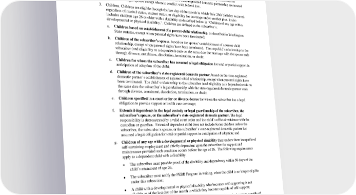 4. Eligible Dependents. The following are eligible as dependents: 1. Legal spouse. 2. State-registered domestic partner and substantially equivalent legal unions from jurisdictions as defined in Washington State statute. Individuals in a state-registered domestic partnership are treated the same as a legal spouse except when in conflict with federal law. 3. Children. Children are eligible through the last day of the month in which their 26th birthday occurred regardless of marital status, student status, or eligibility for coverage under another plan. It also includes children age 26 or older with a disability as described below in “Children of any age with a developmental or physical disability.”. Children are defined as the subscriber’s: a. Children based on establishment of a parent-child relationship, as described in Washington State statutes, except when parental rights have been terminated; b. Children of the subscriber’s spouse, based on the spouse’s establishment of a parent-child relationship, except when parental rights have been terminated. The stepchild’s relationship to the subscriber (and eligibility as a dependent) ends on the same date the marriage with the spouse ends through divorce, annulment, dissolution, termination, or death; c. Children for whom the subscriber has assumed a legal obligation for total or partial support in anticipation of adoption of the child; d. Children of the subscriber’s state-registered domestic partner, based on the state-registered domestic partner’s establishment of a parent-child relationship, except when parental rights have been terminated. The child’s relationship to the subscriber (and eligibility as a dependent) ends on the same date the subscriber’s legal relationship with the state-registered domestic partner ends through divorce, annulment, dissolution, termination, or death; e. Children specified in a court order or divorce decree for whom the subscriber has a legal obligation to provide support or health care coverage; f. Extended dependents in the legal custody or legal guardianship of the subscriber, the subscriber’s spouse, or the subscriber’s state-registered domestic partner. The legal responsibility is demonstrated by a valid court order and the child’s official residence with the custodian or guardian. Extended dependent child does not include foster children unless the subscriber, the subscriber’s spouse, or the subscriber’s state-registered domestic partner has assumed a legal obligation for total or partial support in anticipation of adoption; and g. Children of any age with a developmental or physical disability that renders them incapable of self-sustaining employment and chiefly dependent upon the subscriber for support and maintenance provided such condition occurs before the age of 26. The following requirements apply to a dependent child with a disability: The subscriber must provide proof of the disability and dependency within 60 days of the • child’s attainment of age 26; The subscriber must notify the PEBB Program in writing, when the child is no longer eligible • under this subsection; A child with a developmental or physical disability who becomes self-supporting is not • eligible as of the last day of the month in which they become capable of self-support; A child with a developmental or physical disability age 26 and older who becomes capable of • self-support does not regain eligibility under this subsection if they later become incapable of self-support; and The PEBB Program with input from the medical plan will periodically verify the eligibility of • a dependent child with a disability beginning at age 26, but no more frequently than annually PEBB_CA_2024 48