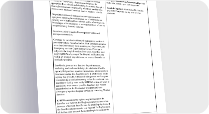 Services to request Preauthorization. Withdrawal Management Services for Alcoholism and Emergency Services Network Facility: After Substance Use Disorder. Deductible, Enrollee pays $250 Copayment Withdrawal management services means the management of Emergency Services Non-Network Facility: After symptoms and complications of alcohol and/or substance Deductible, Enrollee pays $250 Copayment withdrawal. The severity of symptoms designates the appropriate level of care and should be determined through a Hospital - Inpatient: After Deductible, Enrollee thorough assessment completed by a licensed provider who pays $150 Copayment per day up to $750 per recommends treatment based on medical necessity criteria. admission Outpatient withdrawal management services means the symptoms resulting from abstinence are of mild/moderate severity and withdrawal from alcohol and/or other drugs can be managed with medication at an outpatient level of care by an appropriately licensed clinician. Preauthorization is required for outpatient withdrawal management services. Coverage for inpatient withdrawal management services is provided without Preauthorization. If an Enrollee is admitted as an inpatient directly from an emergency department, any Emergency services Copayment is waived. Coverage is subject to the hospital services Cost Share. Enrollees must notify KFHPWA by way of the Hospital notification line within 24 hours of any admission, or as soon thereafter as medically possible. Enrollee is given no less than two days of treatment, excluding weekends and holidays, in a behavioral health agency that provides inpatient or residential substance abuse treatment; and no less than three days in a behavioral health agency that provides withdrawal management services prior to conducting a medical necessity review for continued care. Enrollee or facility must notify KFHPWA within 24 hours of admission, or as soon as possible. Enrollees may request preauthorization for Residential Treatment and non- Emergency inpatient hospital services by contacting Member Services. KFHPWA reserves the right to require transfer of the Enrollee to a Network Facility/program upon consultation between a Network Provider and the attending physician. If the Enrollee refuses transfer to a Network Facility/program, all further costs incurred during the hospitalization are the responsibility of the Enrollee. Exclusions: Wilderness therapy or aversion therapy; facilities and treatment programs which are not certified by the Department of Social Health Services PEBB_CA_2024 42