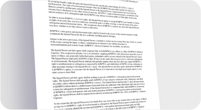 If the Injured Person’s injuries were caused by a third party giving rise to a claim of legal liability against the third party and/or payment by the third party to the Injured Person and/or a settlement between the third party and the Injured Person, KFHPWA shall have the right to recover KFHPWA's Medical Expenses from any source available to the Injured Person as a result of the events causing the injury. This right is commonly referred to as "subrogation." KFHPWA shall be subrogated to and may enforce all rights of the Injured Person to the full extent of KFHPWA's Medical Expenses. By accepting benefits under this plan, the Injured Person also specifically acknowledges KFHPWA’s right of reimbursement. This right of reimbursement attaches when this KFHPWA has provided benefits for injuries or illnesses caused by another party and the Injured Person or the Injured Person’s representative has recovered any amounts from a third party or any other source of recovery. KFHPWA’s right of reimbursement is cumulative with and not exclusive of its subrogation right and KFHPWA may choose to exercise either or both rights of recovery. In order to secure KFHPWA’s recovery rights, the Injured Person agrees to assign KFHPWA any benefits or claims or rights of recovery they may have under any automobile policy or other coverage, to the full extent of the plan’s subrogation and reimbursement claims. This assignment allows KFHPWA to pursue any claim the Injured Person may have, whether or not they choose to pursue the claim. KFHPWA’s subrogation and reimbursement rights shall be limited to the excess of the amount required to fully compensate the Injured Person for the loss sustained, including general damages. Subject to the above provisions, if the Injured Person is entitled to or does receive money from any source as a result of the events causing the injury or illness, including but not limited to any liability insurance or uninsured/underinsured motorist funds, KFHPWA’s Medical Expenses are secondary, not primary. The Injured Person and their agents shall cooperate fully with KFHPWA in its efforts to collect KFHPWA's Medical Expenses. This cooperation includes, but is not limited to, supplying KFHPWA with information about the cause of injury or illness, any potentially liable third parties, defendants and/or insurers related to the Injured Person's claim. The Injured Person shall notify KFHPWA within 30 days of any claim that may give rise to a claim for subrogation or reimbursement. The Injured Person shall provide periodic updates about any facts that may impact KFHPWA’s right to reimbursement or subrogation as requested by KFHPWA, and shall inform KFHPWA of any settlement or other payments relating to the Injured Person’s injury. The Injured Person and their agents shall permit KFHPWA, at KFHPWA's option, to associate with the Injured Person or to intervene in any legal, quasi-legal, agency or any other action or claim filed. The Injured Person and their agents shall do nothing to prejudice KFHPWA’s subrogation and reimbursement rights. The Injured Person shall promptly notify KFHPWA of any tentative settlement with a third party and shall not settle a claim without protecting KFHPWA’s interest. The Injured Person shall provide 21 days advance notice to KFHPWA before there is a disbursement of proceeds from any settlement with a third party that may give rise to a claim for subrogation or reimbursement. If the Injured Person fails to cooperate fully with KFHPWA in recovery of KFHPWA’s Medical Expenses, and such failure prejudices KFHPWA’s subrogation and/or reimbursement rights, the Injured Person shall be responsible for directly reimbursing KFHPWA for 100% of KFHPWA’s Medical Expenses. To the extent that the Injured Person recovers funds from any source that in any manner relate to the injury or illness giving rise to KFHPWA’s right of reimbursement or subrogation, the Injured Person agrees to hold such monies in trust or in a separate identifiable account until KFHPWA’s subrogation and reimbursement rights are fully determined and that KFHPWA has an equitable lien over such monies to the full extent of KFHPWA’s Medical Expenses and/or the Injured Person agrees to serve as constructive trustee over the monies to the extent of KFHPWA’s Medical Expenses. In the event that such monies are not so held, the funds are recoverable even if they have been comingled with other assets, without the need to trace the source of the funds. Any party who distributes funds without regard to KFHPWA’s rights of subrogation or reimbursement will be personally liable to KFHPWA for the amounts so distributed. PEBB_CA_2024 69